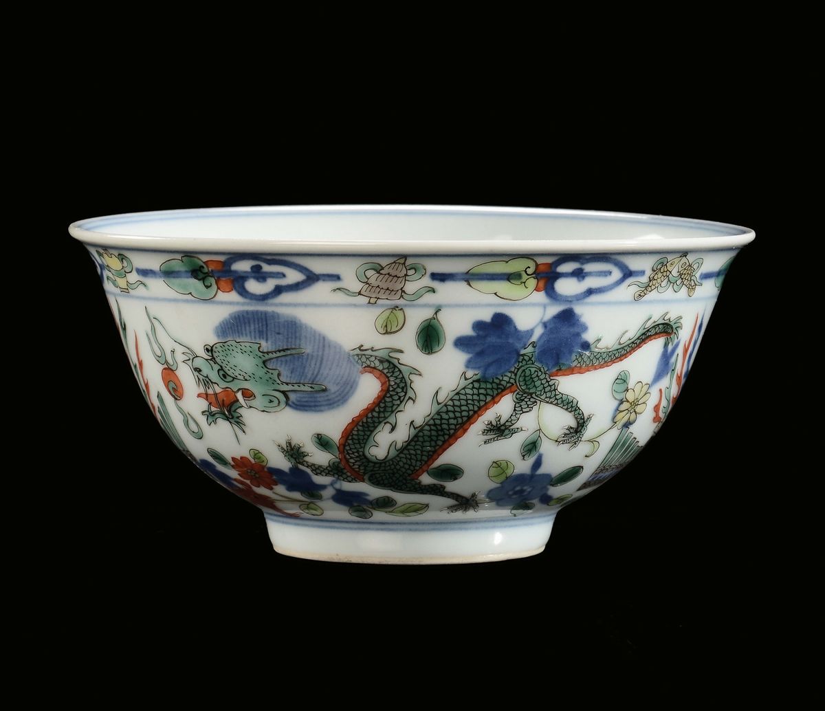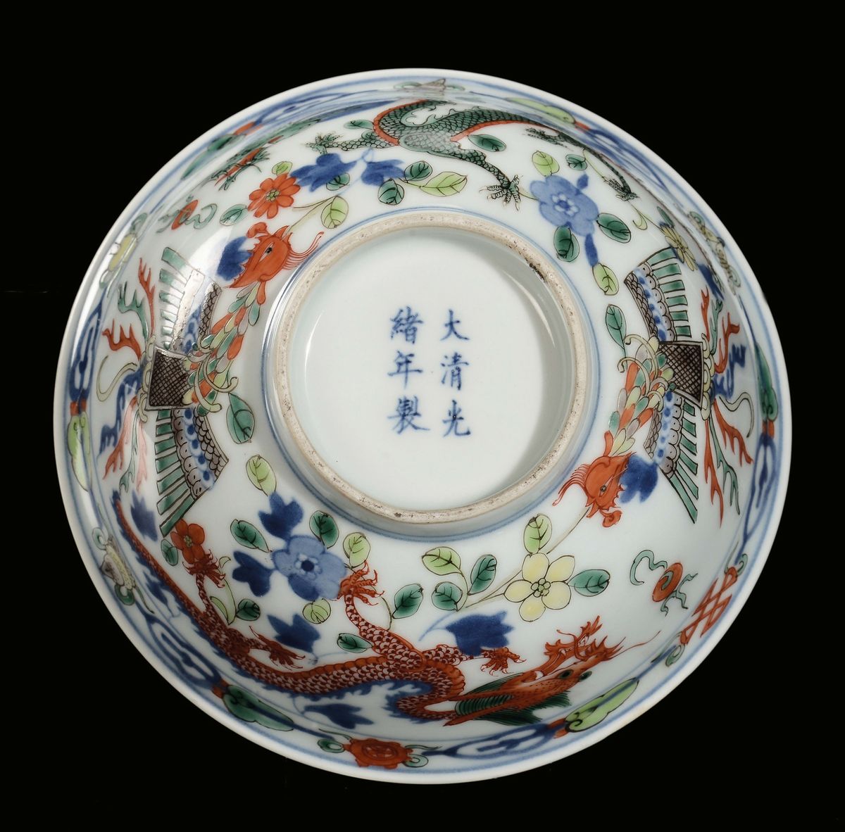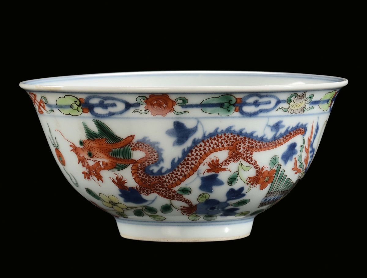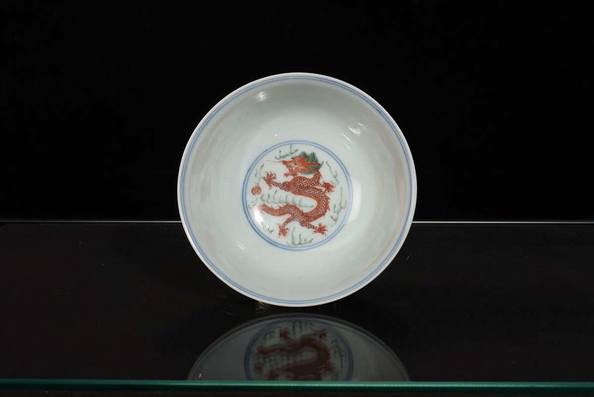 Ciotola in porcellana policroma con decoro floreale e drago, Cina, Dinastia Qing, XIX secolo