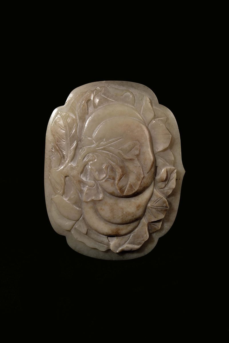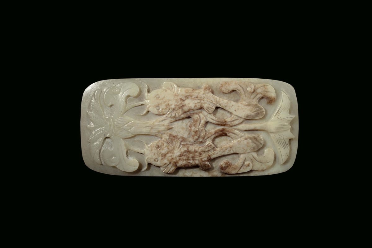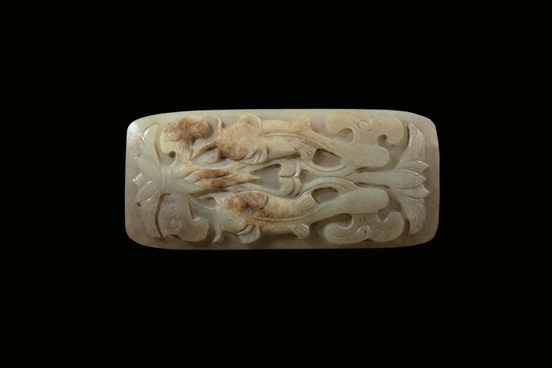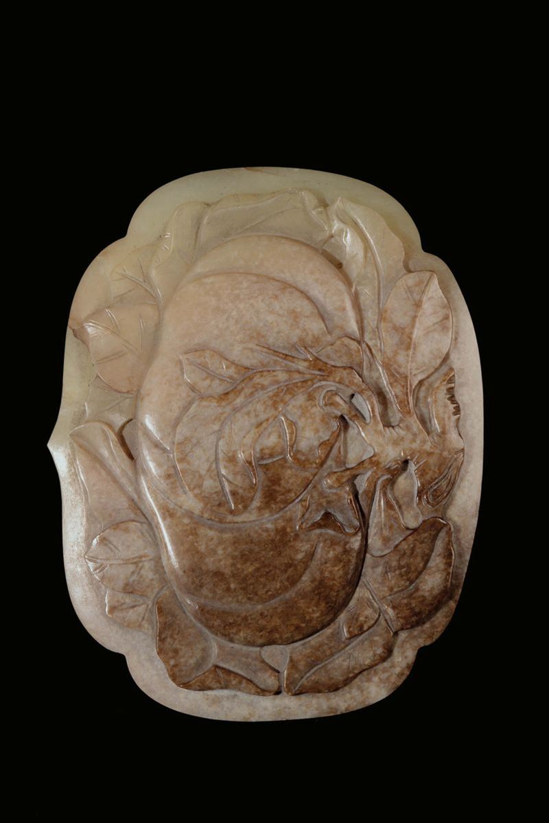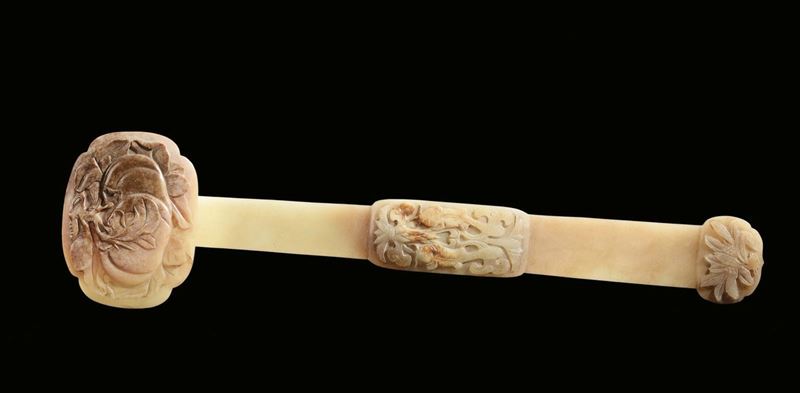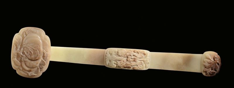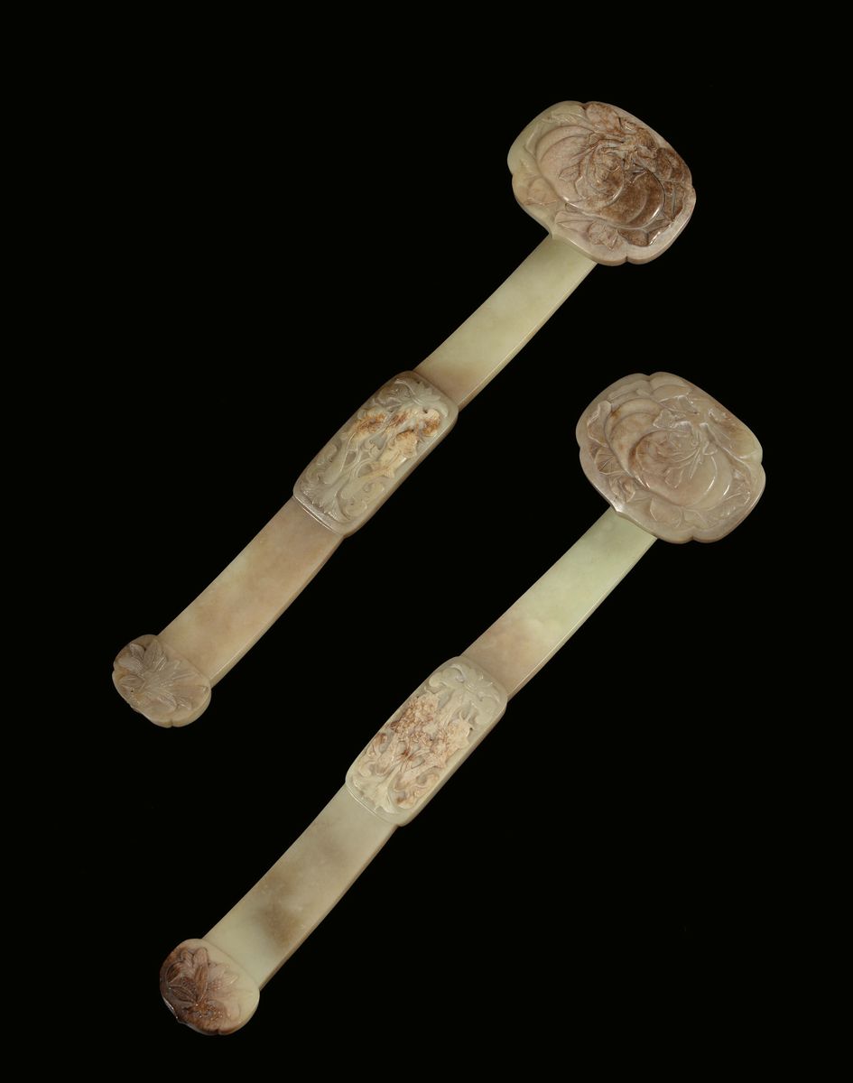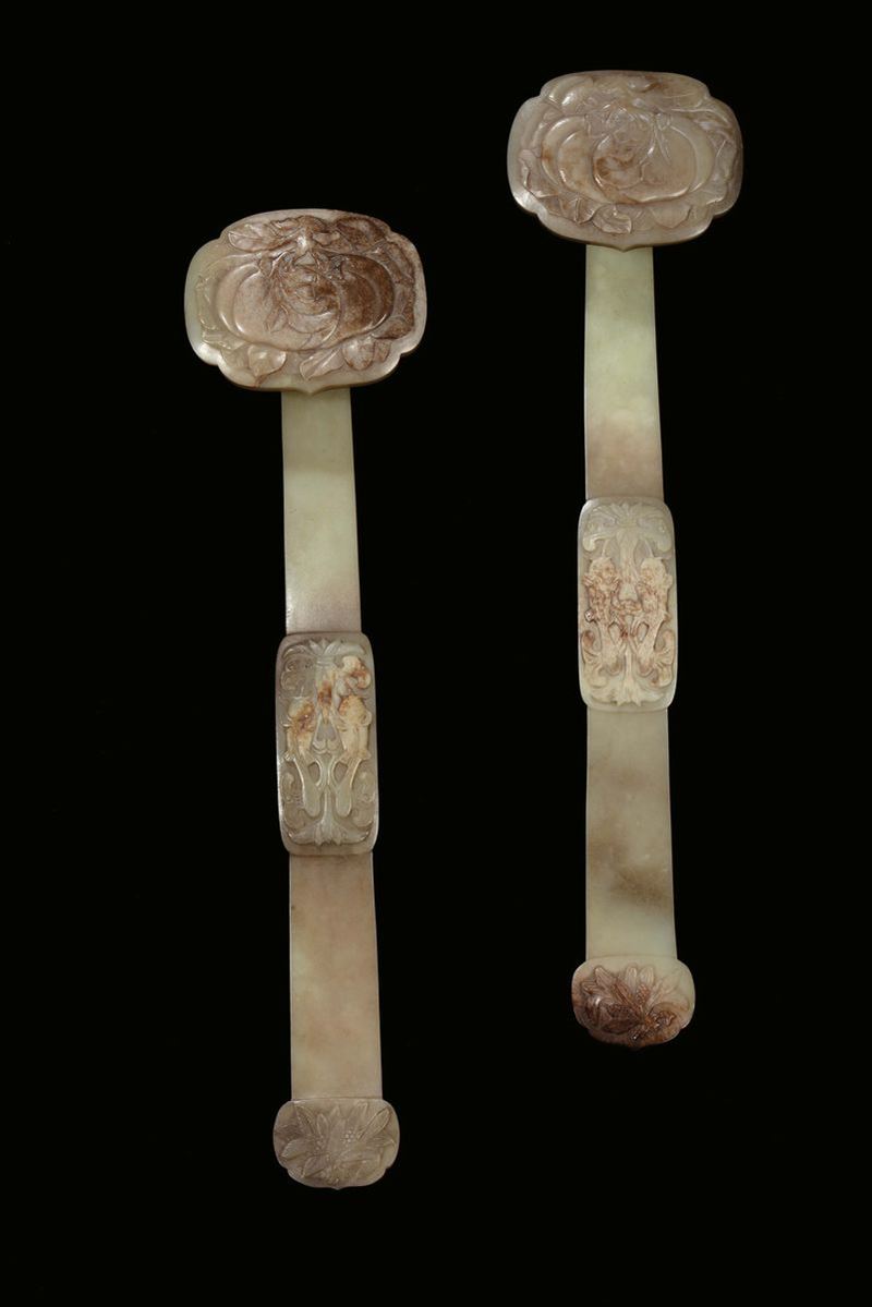 Coppia di rarissimi e grandi Ruyi in giada gialla con motivo di frutti di pesca, pesci e spighe di granturco, Cina, Dinastia [..]