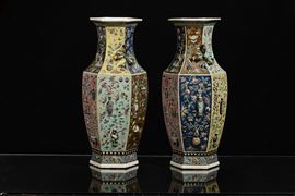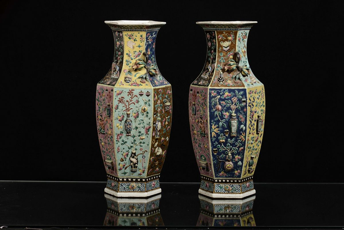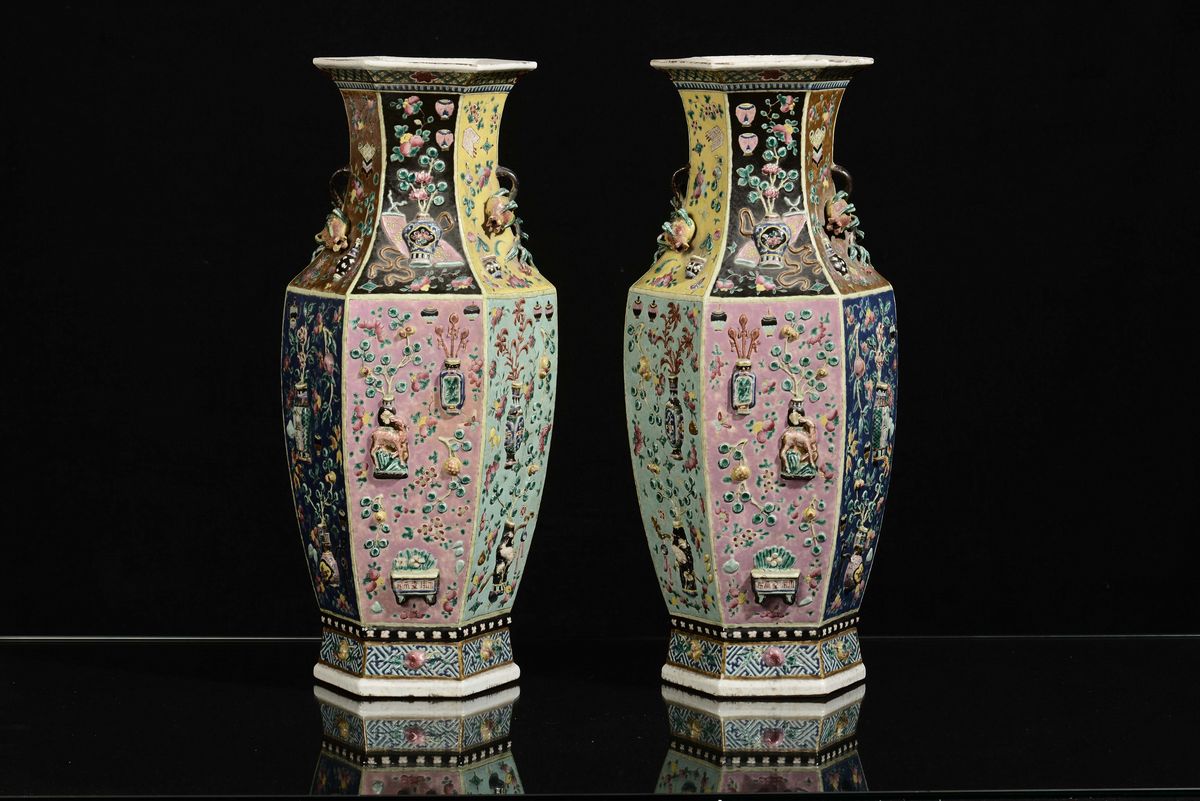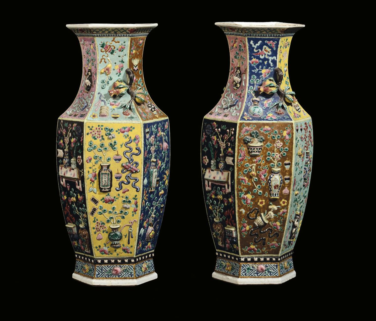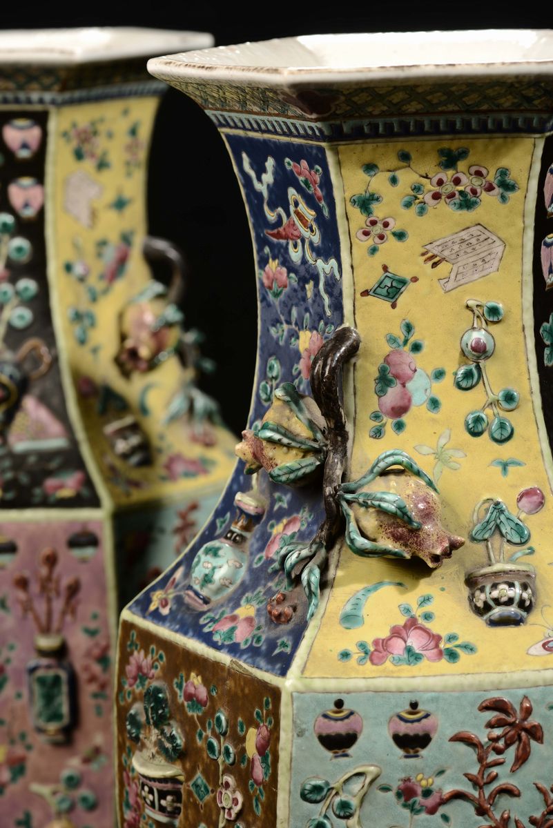 Coppia di vasi Famiglia Rosa, in porcellana policroma con decoro a rilievo, Cina, Dinastia Qing, XIX secolo