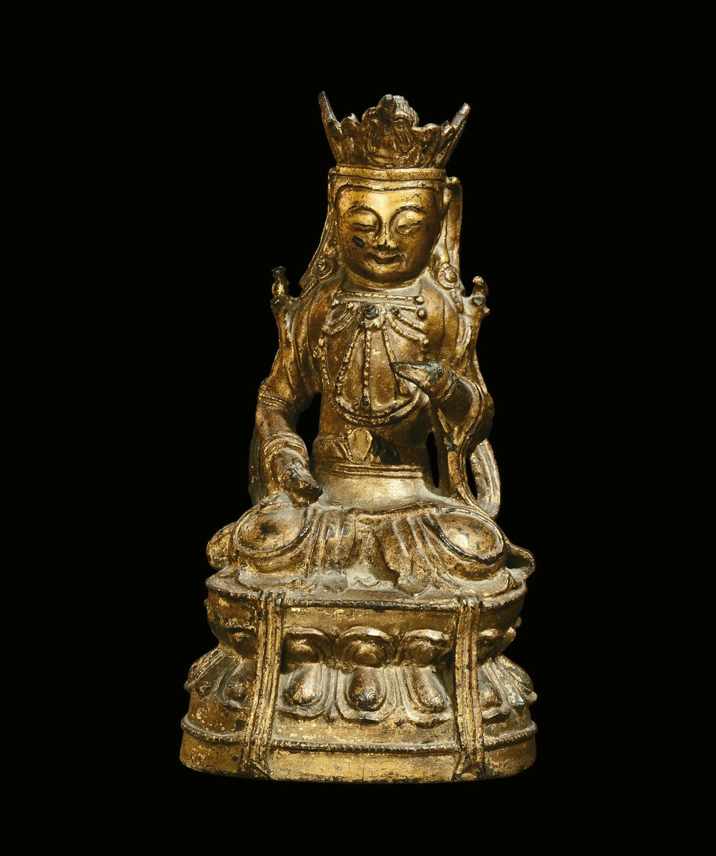 Figura di Sakyamuni seduto in bronzo dorato, Cina, Dinastia Ming, XVII secolo