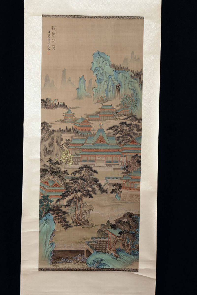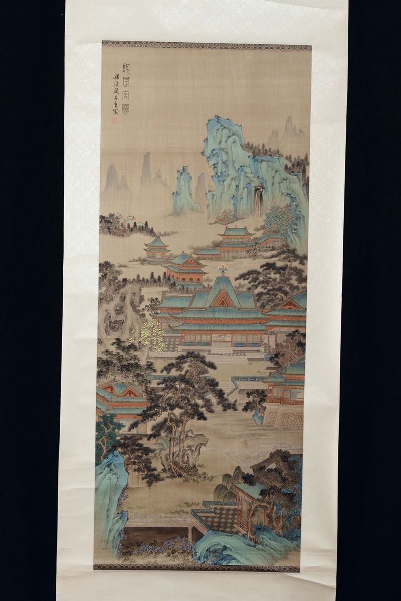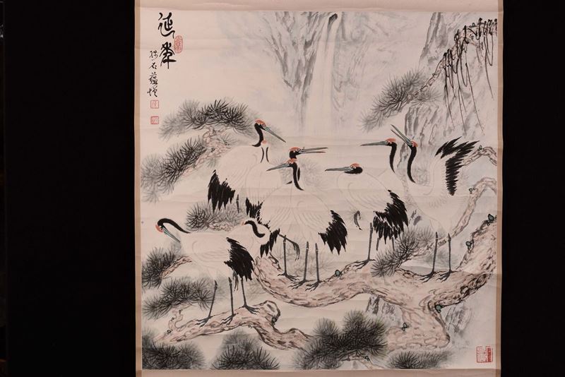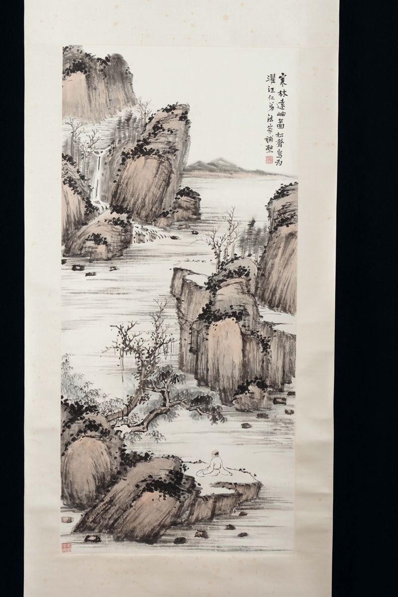 Gruppo di quattro scroll con paesaggi e soggetti naturalistici con piccola iscrizione, Cina