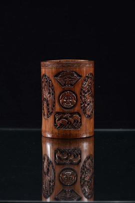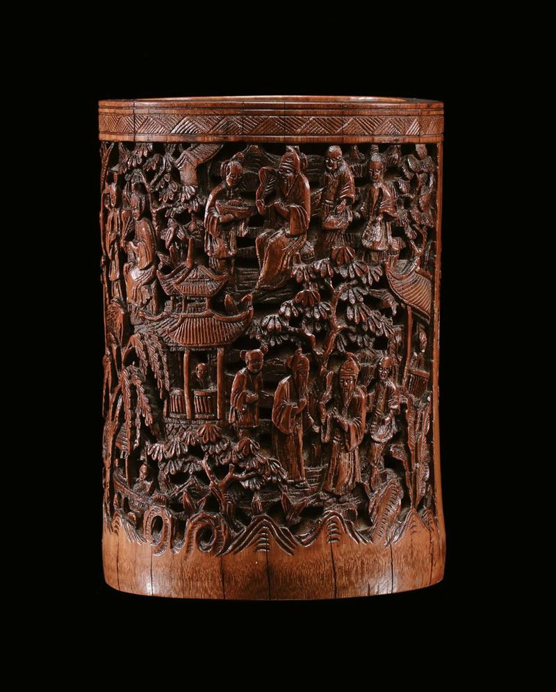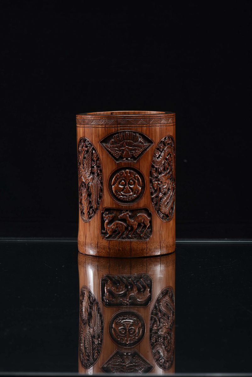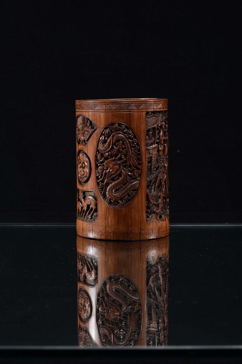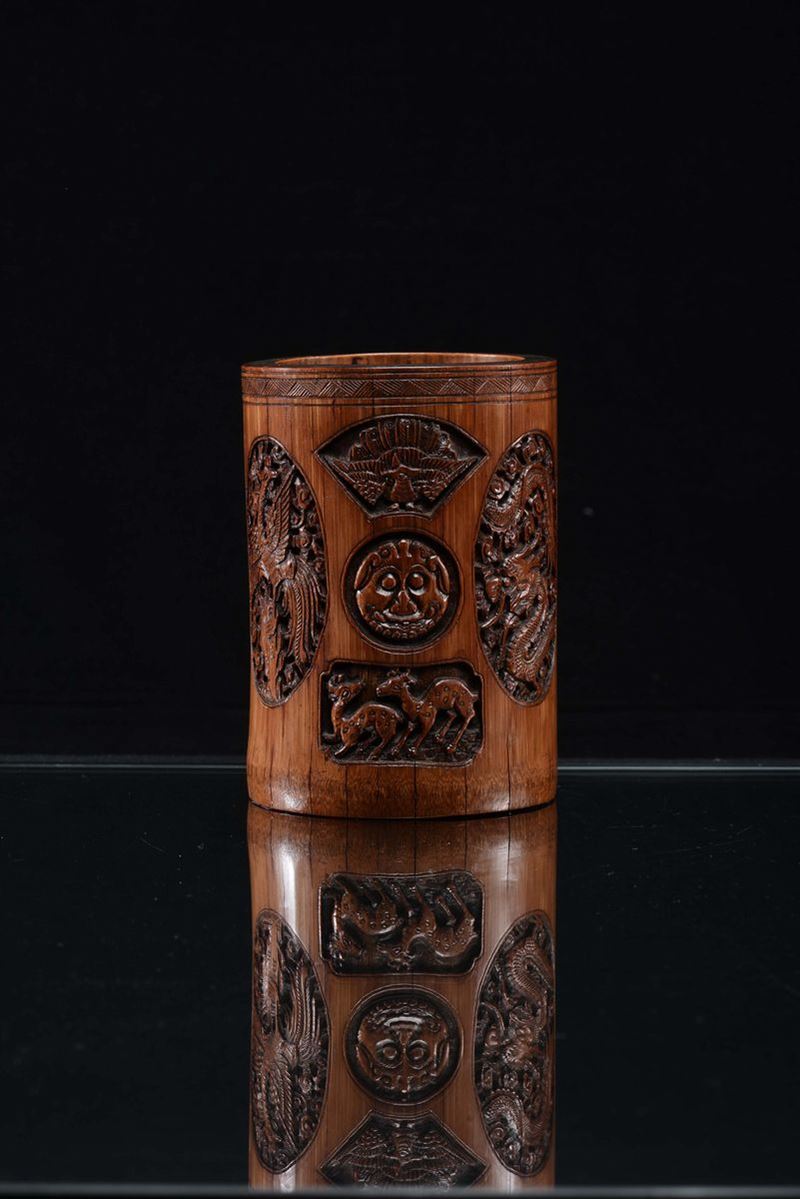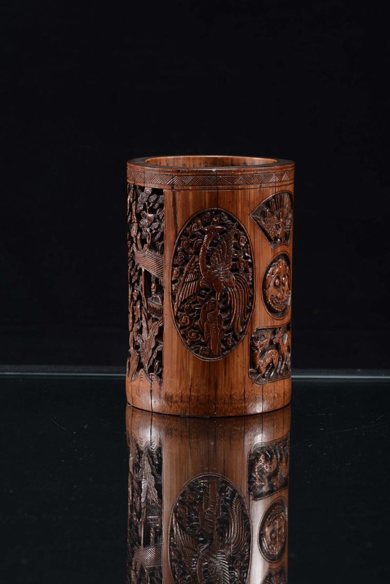Portapennello in bamboo finemente intagliato a motivi floreali, Cina, Dinastia Qing, XIX secolo
