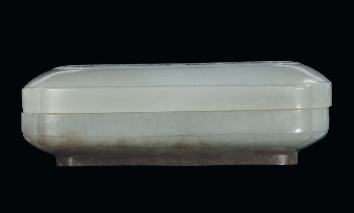 Scatola in giada celadon incisa a motivi floreali a forma rettangolare con angoli lobati, Cina Dinastia Qing, Periodo Qianlong [..]