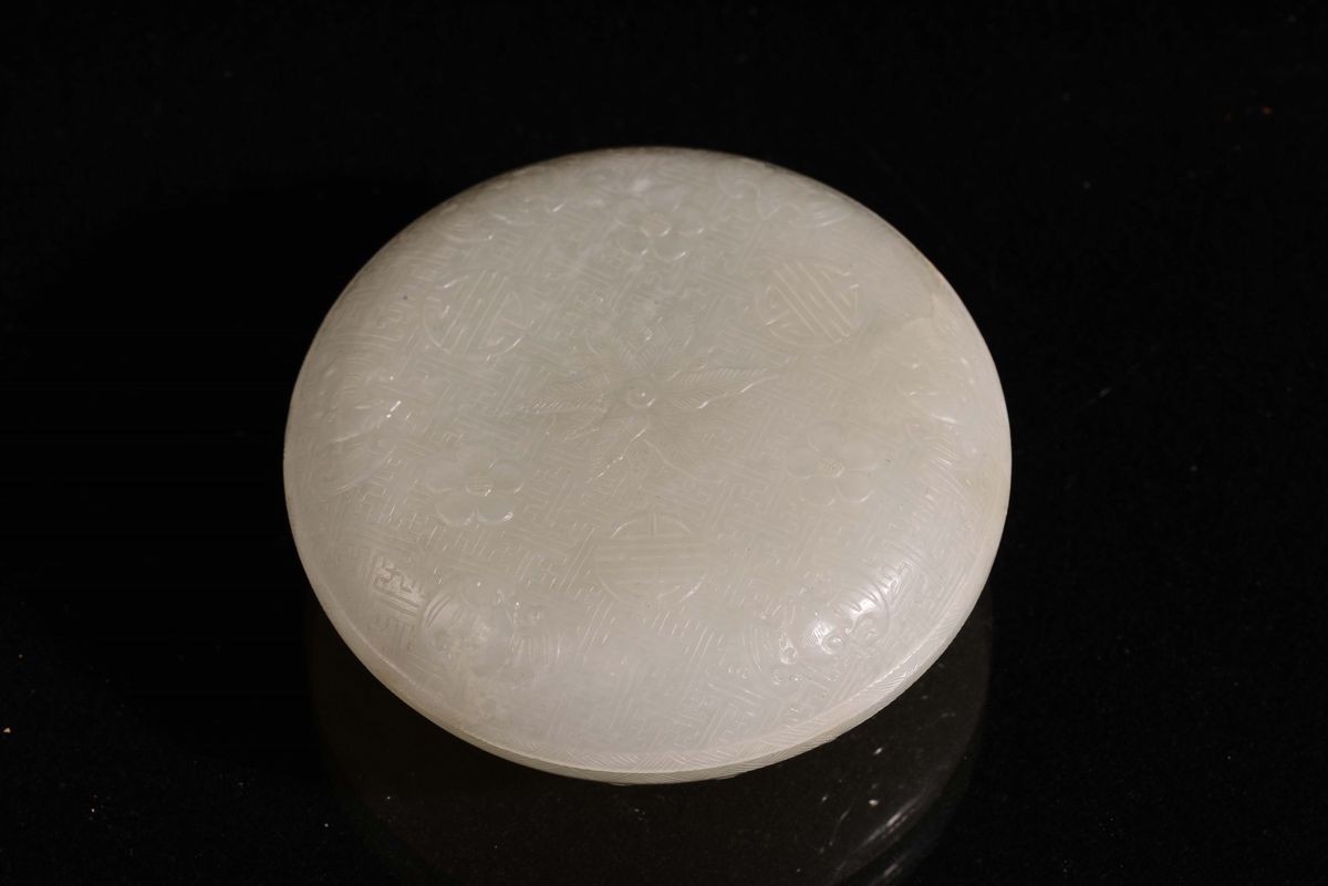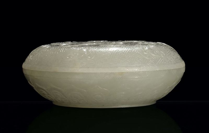Scatoletta rotonda in giada bianca Celadon con fini incisioni floreali e arcaiche, Dinastia Qing, periodo Qianlong, XVIII [..]