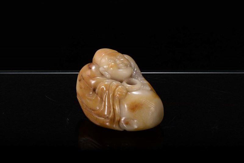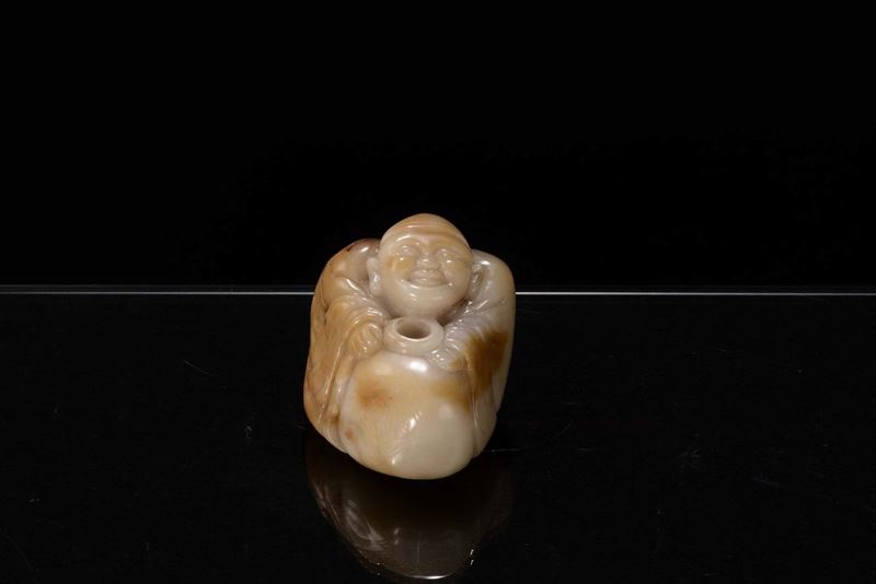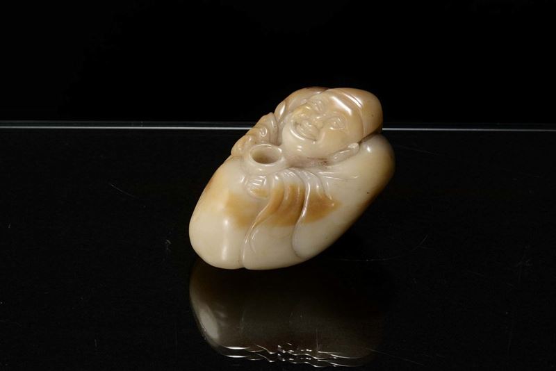 Scultura in giada bianca e russet raffigurante piccolo Budai, Cina, Dinastia Qing, XIX secolo