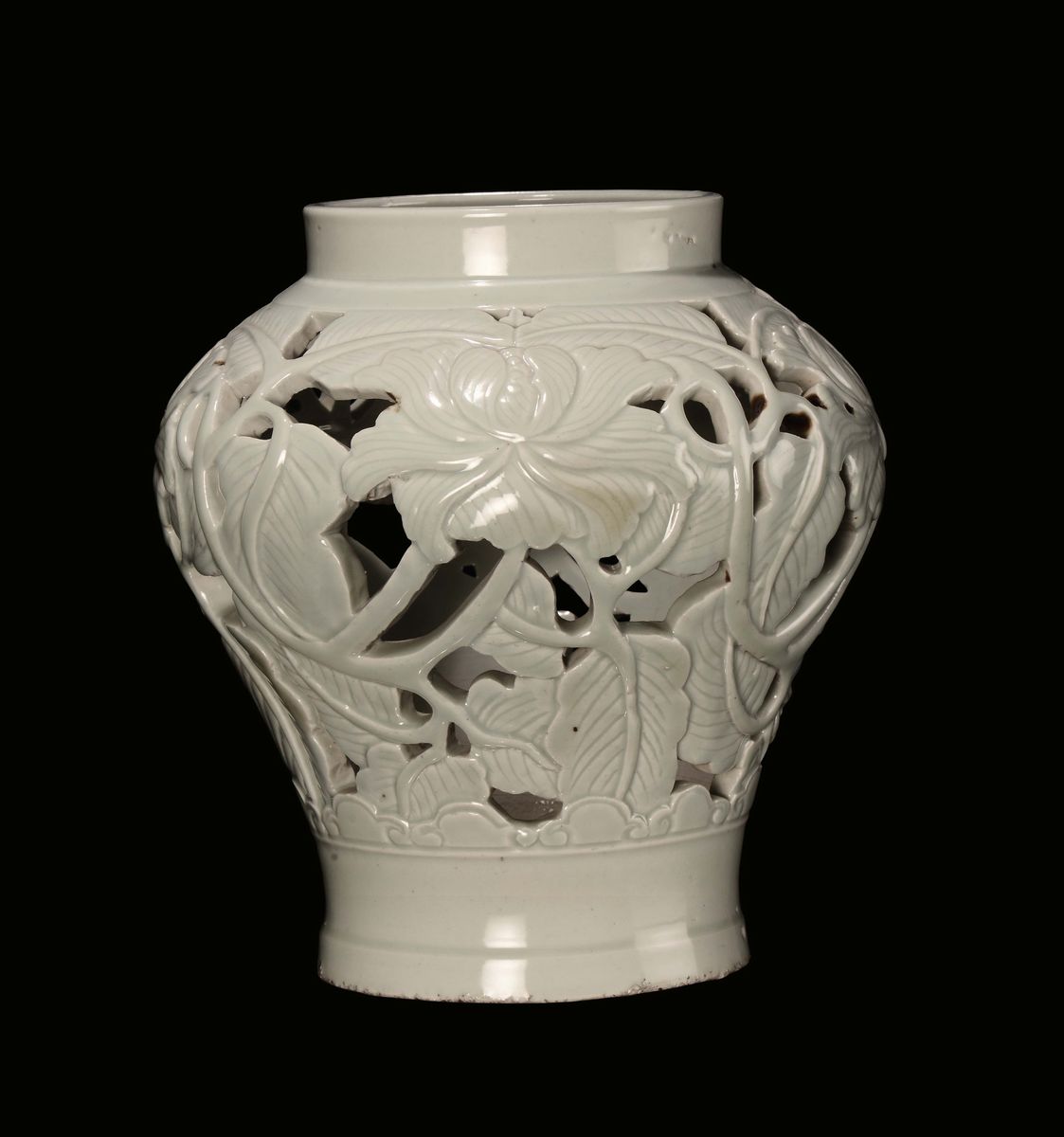 Vaso in porcellana monocroma traforato e decorato con fiori, Corea, inizi XX secolo