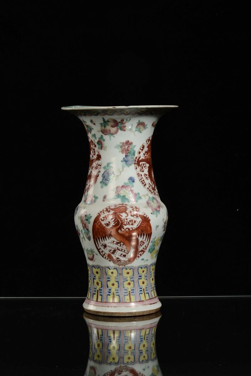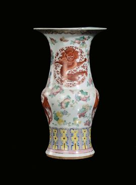 Vaso in porcellana policroma decorata con forme stilizzate e rosoni con drago, Cina, Dinastia Qing, XIX secolo