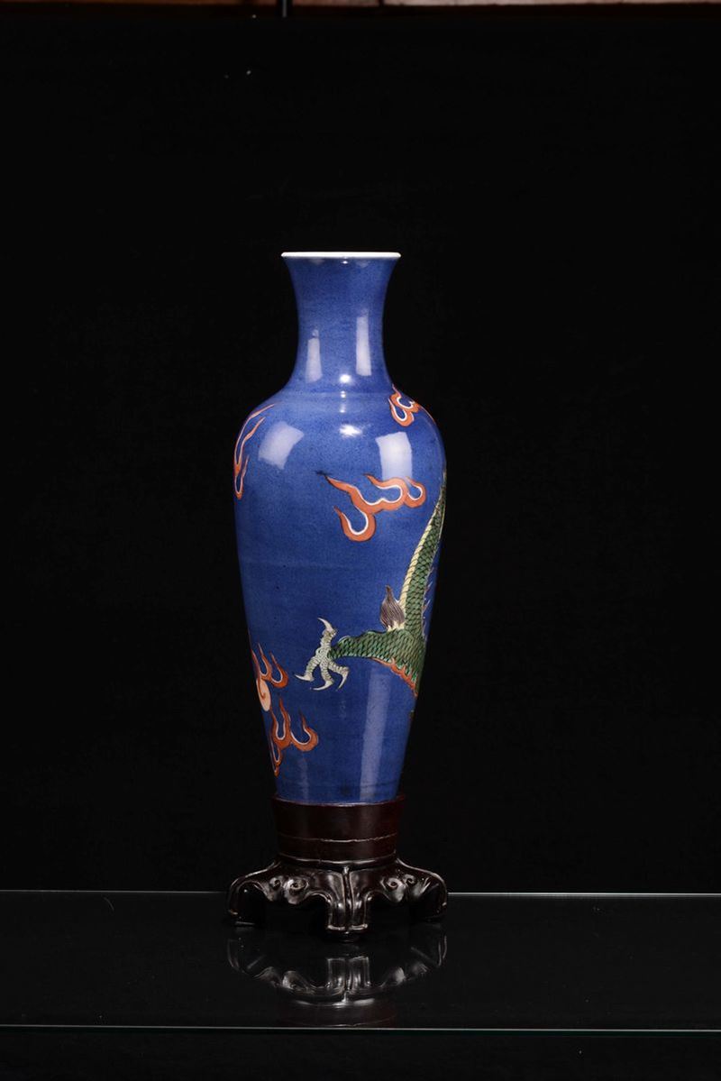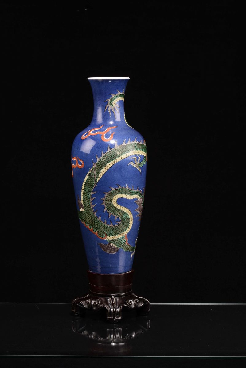 Vaso in porcellana policroma su fondo blu con raffigurazione di dragone, Cina, Dianstia Qing, XIX secolo