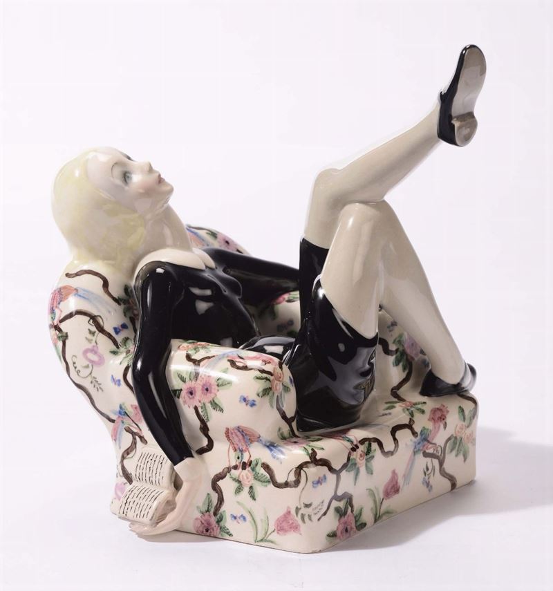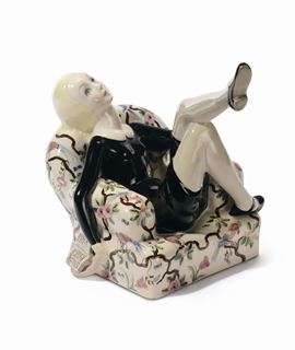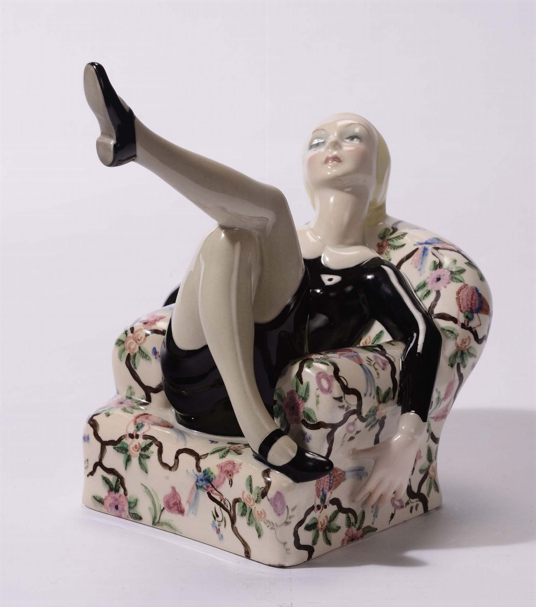 Terracotta maiolicata modellata a colaggio e smaltata in policromia sotto vernice. Sotto la base: Lenci Made in Italy Torino 10-XI. Altezza cm 25,5