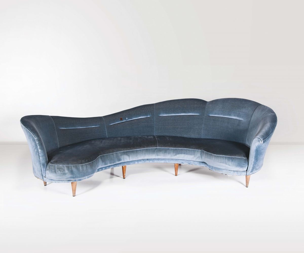 Cesare Lacca. Raro divano curvo in legno con rivestimenti in velluto. Prod. Italia, 1950 ca.
