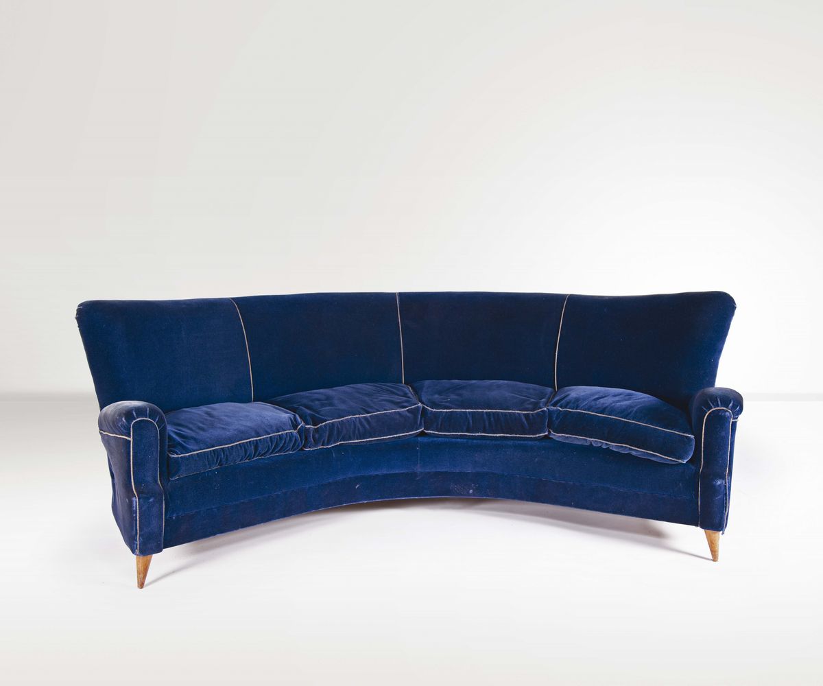 Divano curvo in legno con rivestimenti in velluto. Prod. Italia, 1950 ca.