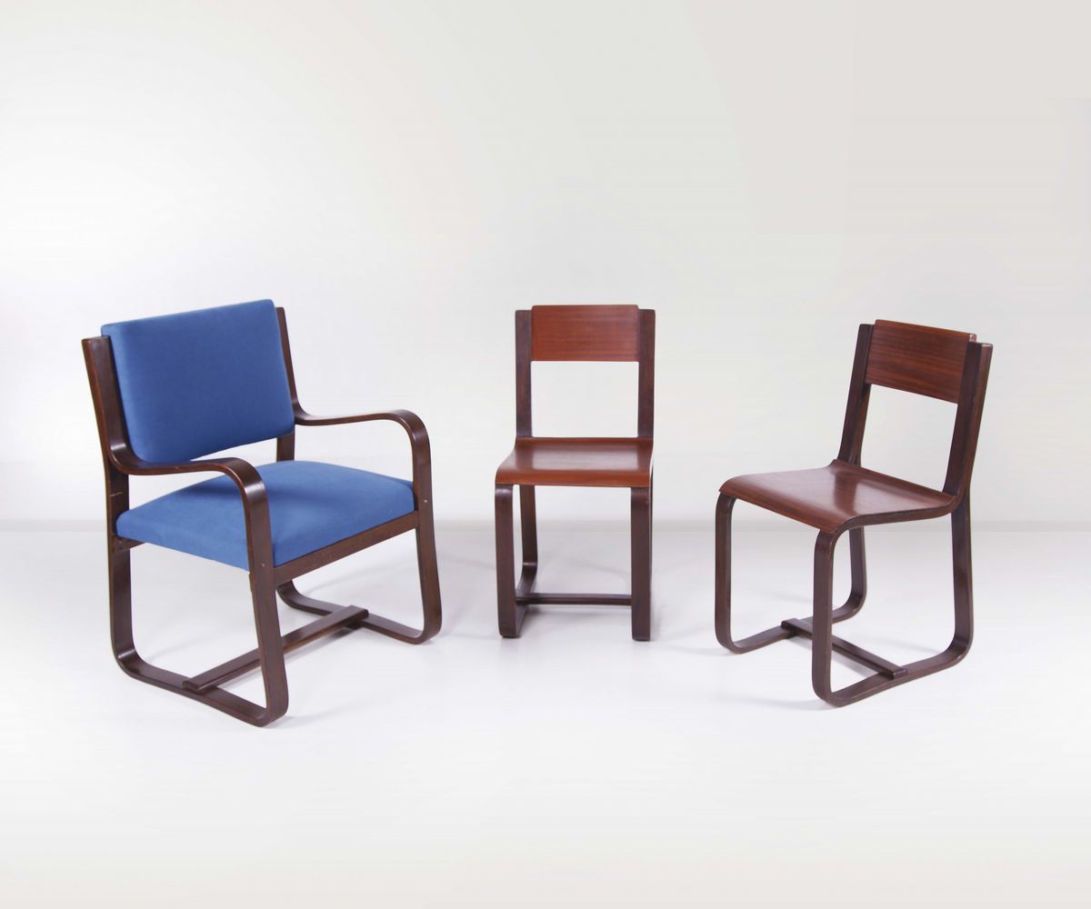 Coppia di sedie in compensato e sedia con braccioli rivestita in tessuto provenienti dall’ Università Comerciale Luigi Bocconi. cm Sedie: 40x83x50; Poltrona: 59x89x59