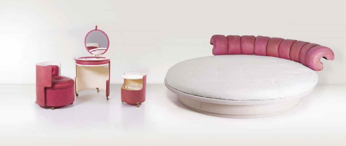 Letto girevole con struttura in legno in parte imbottita e foderata, testiera con struttura in acciaio cromato e cuscini circolari in pelle e rete in metallo con cuscino. Vanity e sedia cilindrinche rivestite in cuoio che si adattano per chiudersi e formare un tavolino rotondo. Sgabello rivestito in cuoio. cm Letto: 71x205 ; Vanity: 73.5x65.5; Sedia: 69x64; Sgabello: 51.5x43