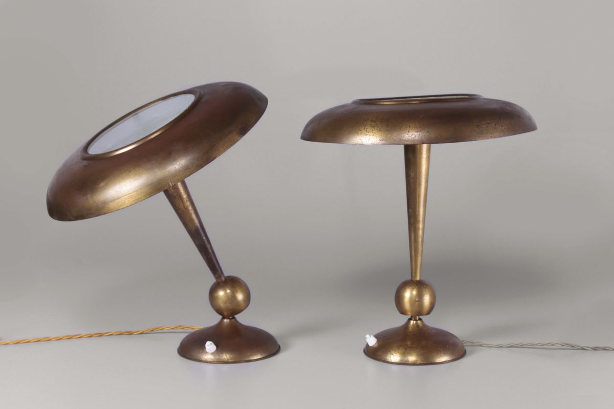 Oscar Torlasco. Coppia di lampade da tavolo orientabili in ottone. Prod. Lumi, Italia, 1950 ca.
