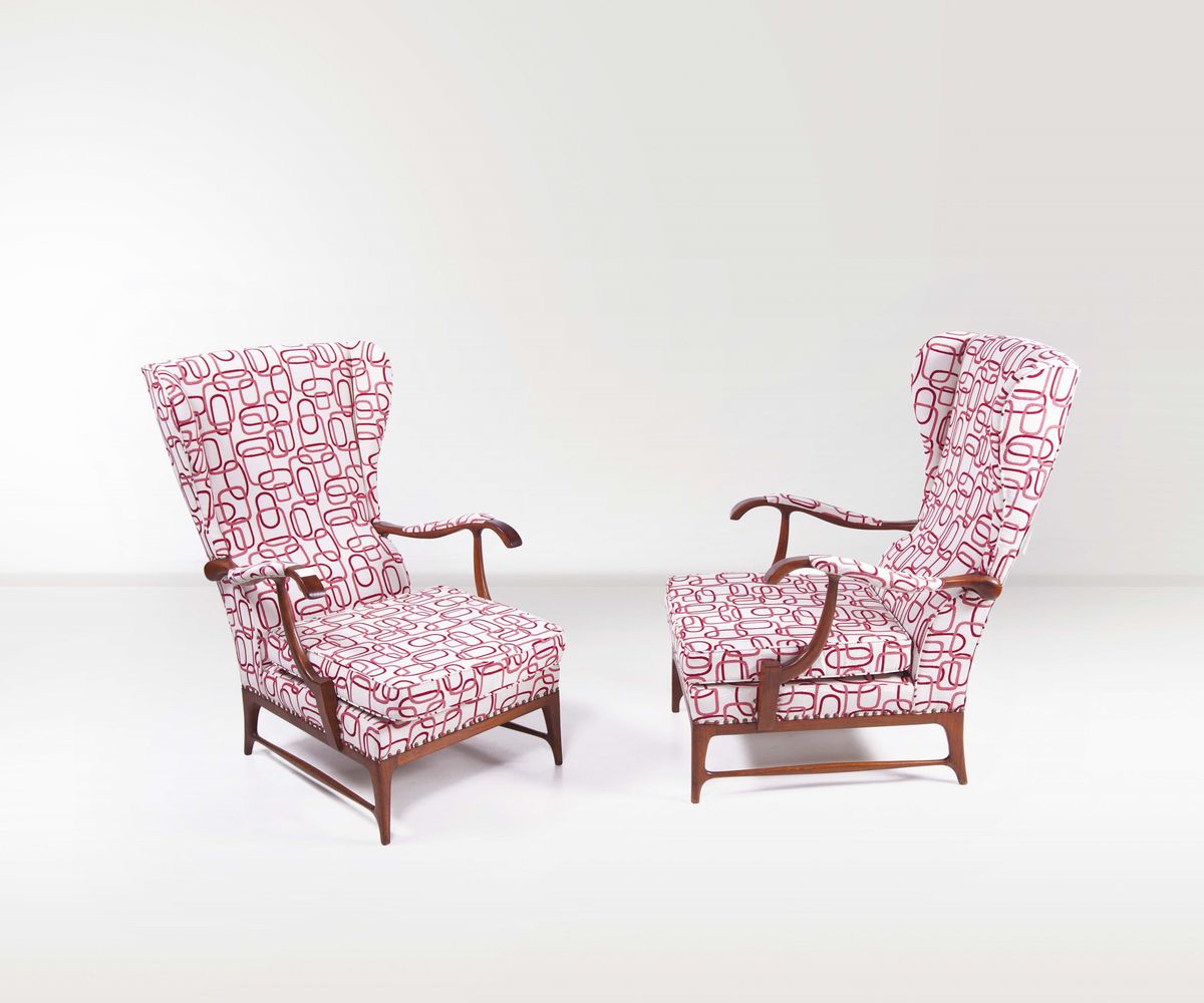 Paolo Buffa(attribuzione) coppia di poltrone in legno con rivestimenti in tessuto.Prod Italia 1950 c.a.