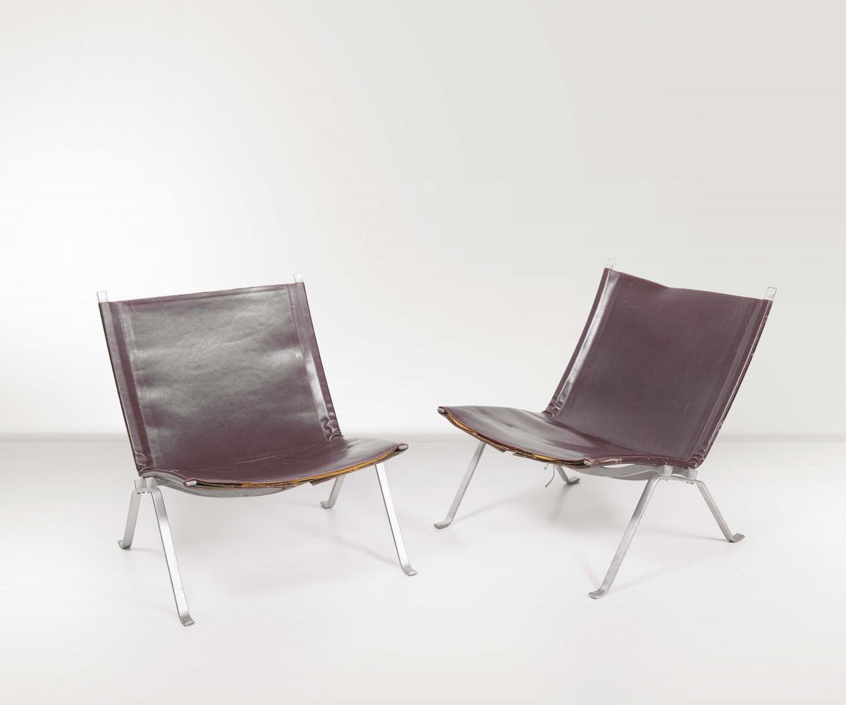 Poul Kjærholm Coppia di sedie PK22 in acciaio satinato e pelle Prod. Kold Christensen, Danimarca, 1958