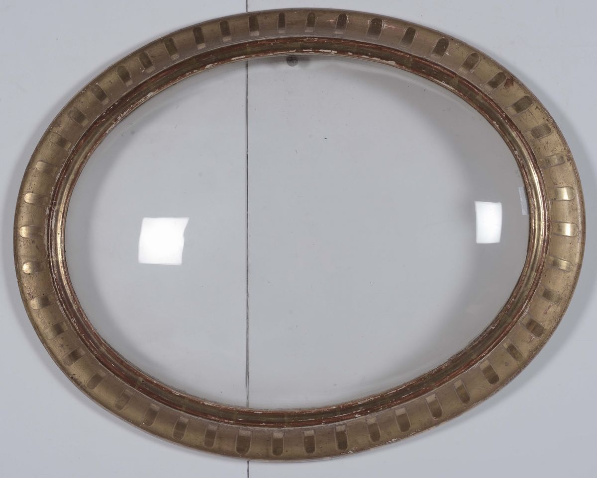 a) cimasa decorata con trionfo di fiori, battuta baccellata, cm 40x25 b) ovale in legno dorato, fascia decorata con motivi geometrici cm 43x35 (36x26,5)
