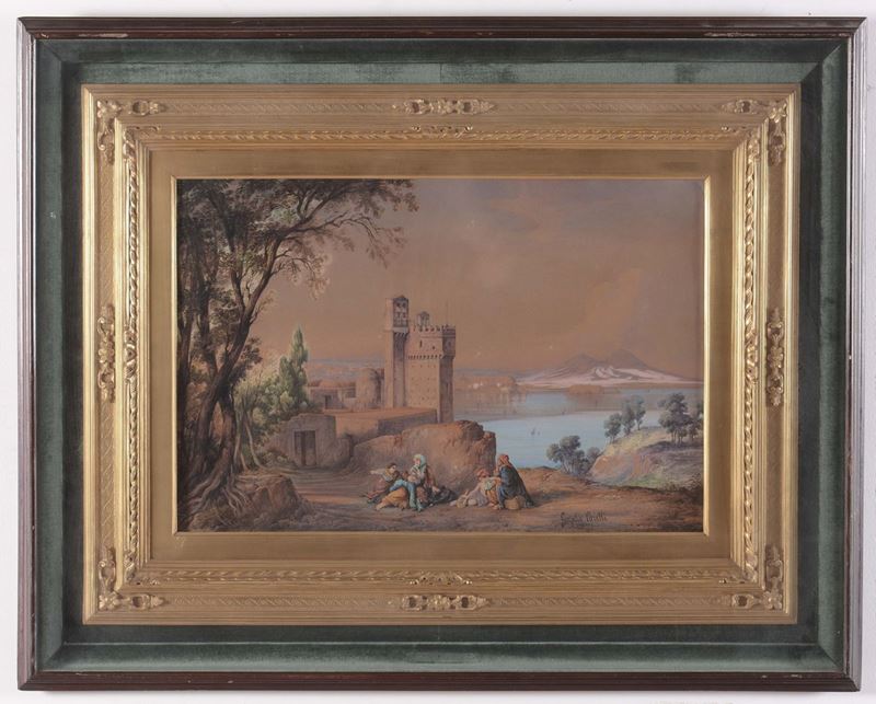 coppia di dipinti a tempera su carta, cm 35x55, firmati Carelli