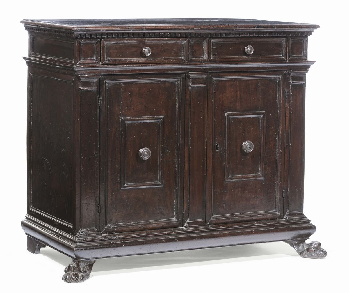 piano rettangolare, due ante e due cassetti sottostanti, lesene sui montanti, piedi ferini, cm 140x73x118
