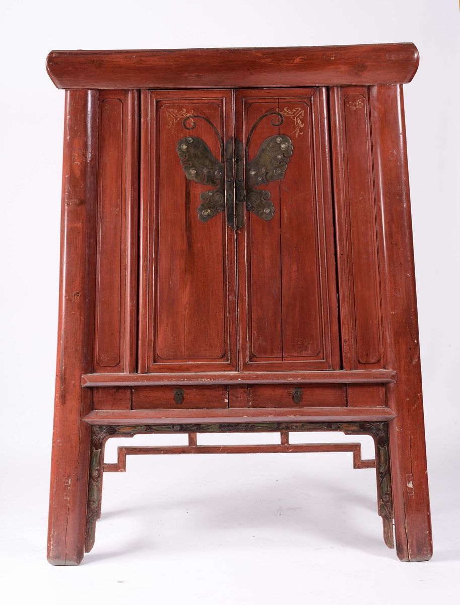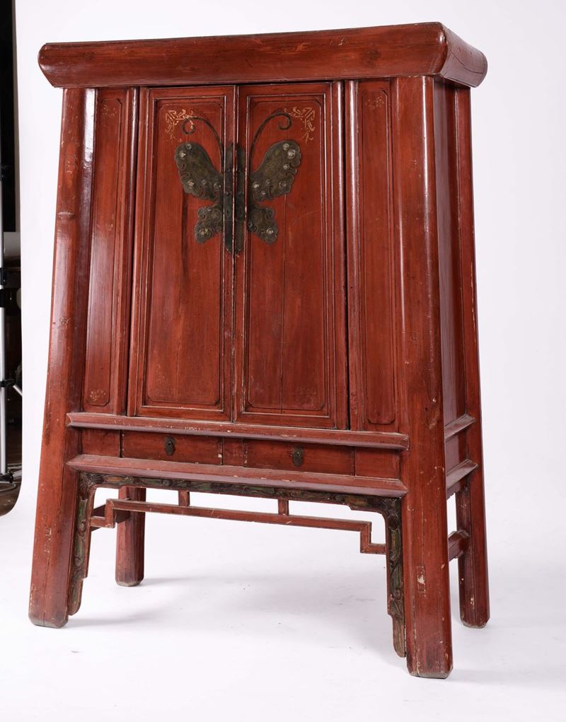 Armadio in legno laccato rosso a due ante, Cina XIX secolo
