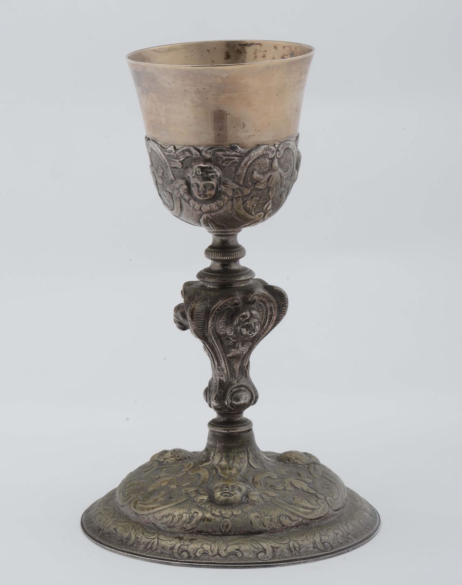 Calice in rame argentato fuso e cesellato con motivi vegetali e testine di cherubini, fine XIX secolo