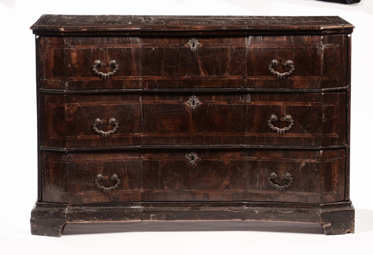 Cassettone lastronato in noce con fronte scantonato, XVIII secolo