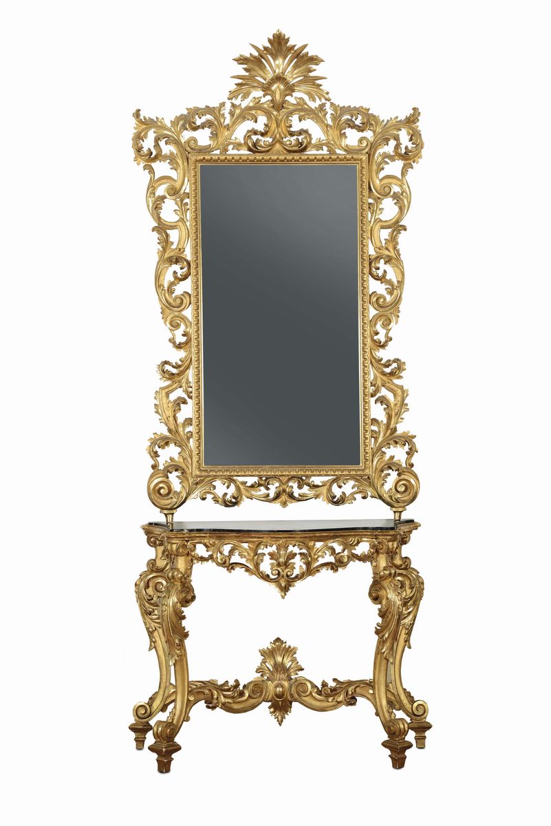 Console con specchiera Luigi XV in legno intagliato e dorato, XVIII-XIX secolo