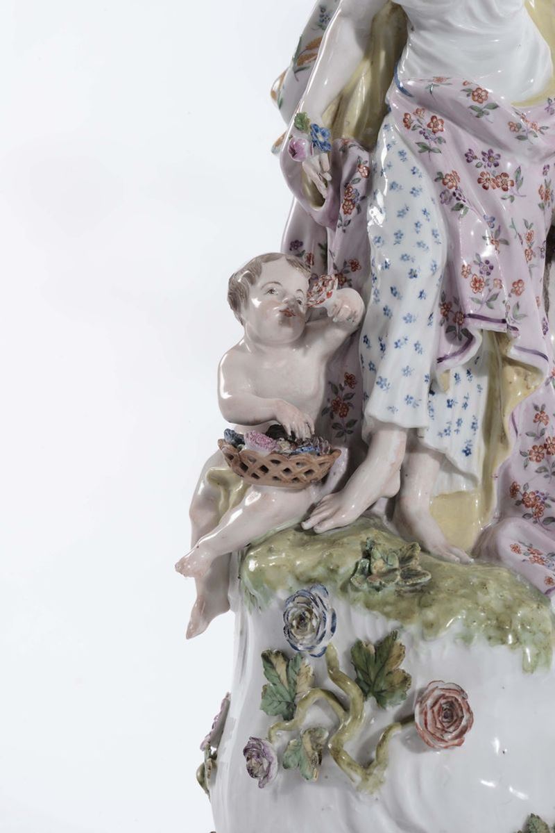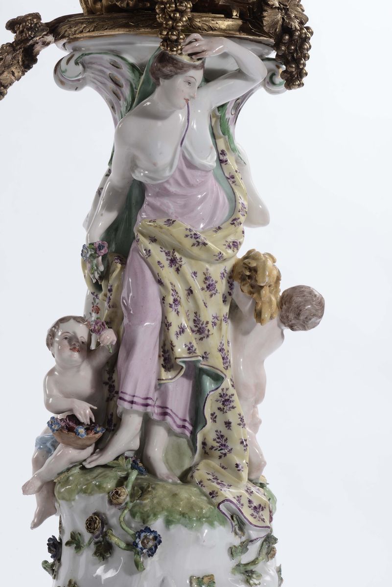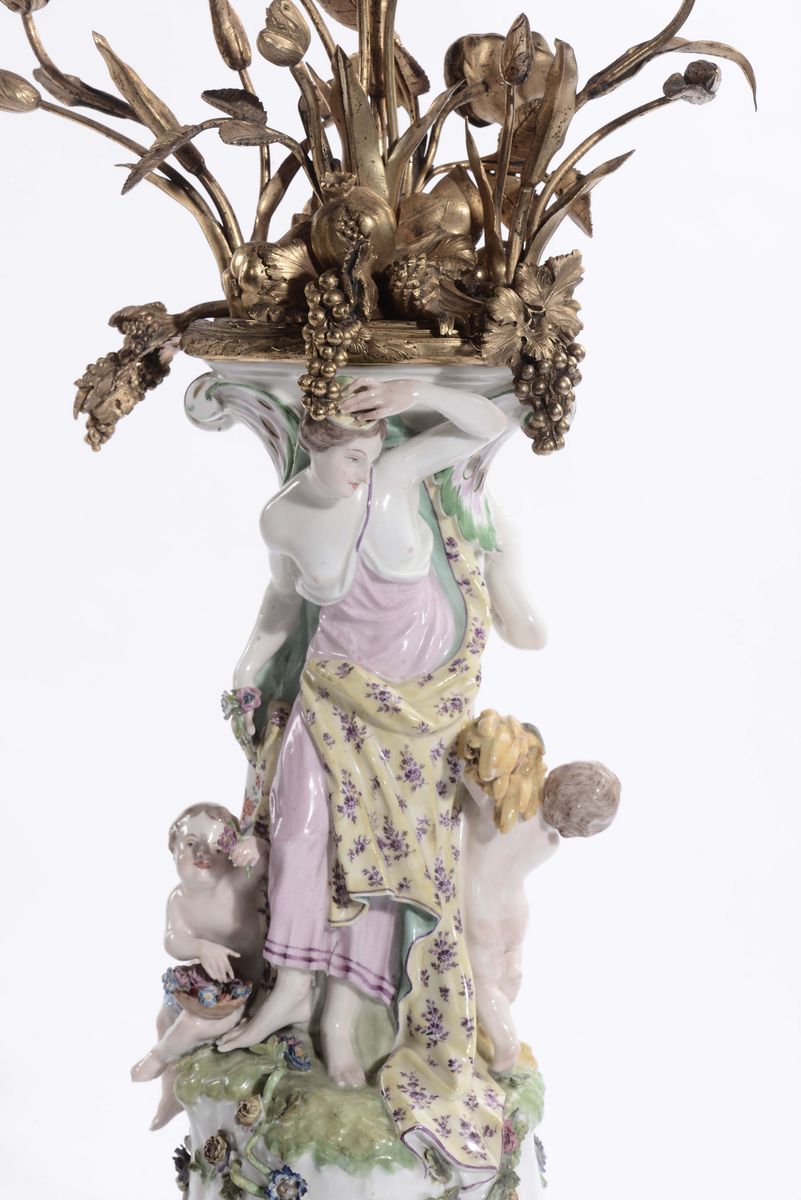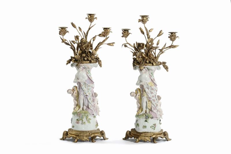 Coppia di candelabri in bronzo dorato e porcellana policroma di Meissen, XIX secolo