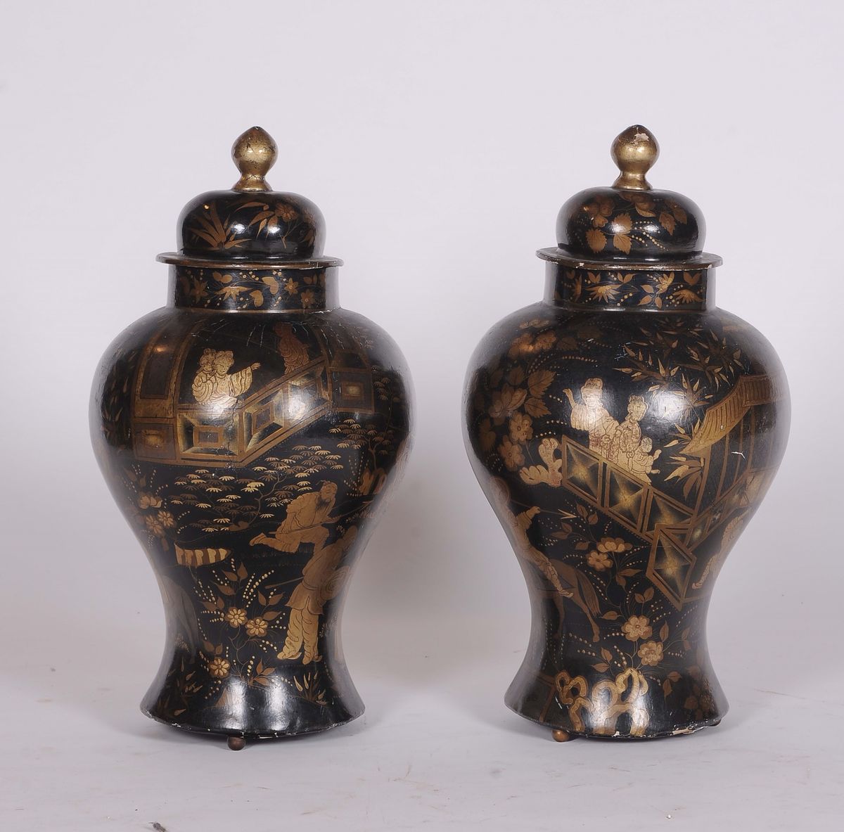 Coppia di vasi con coperchio in lacca nera decorati in oro, Cina