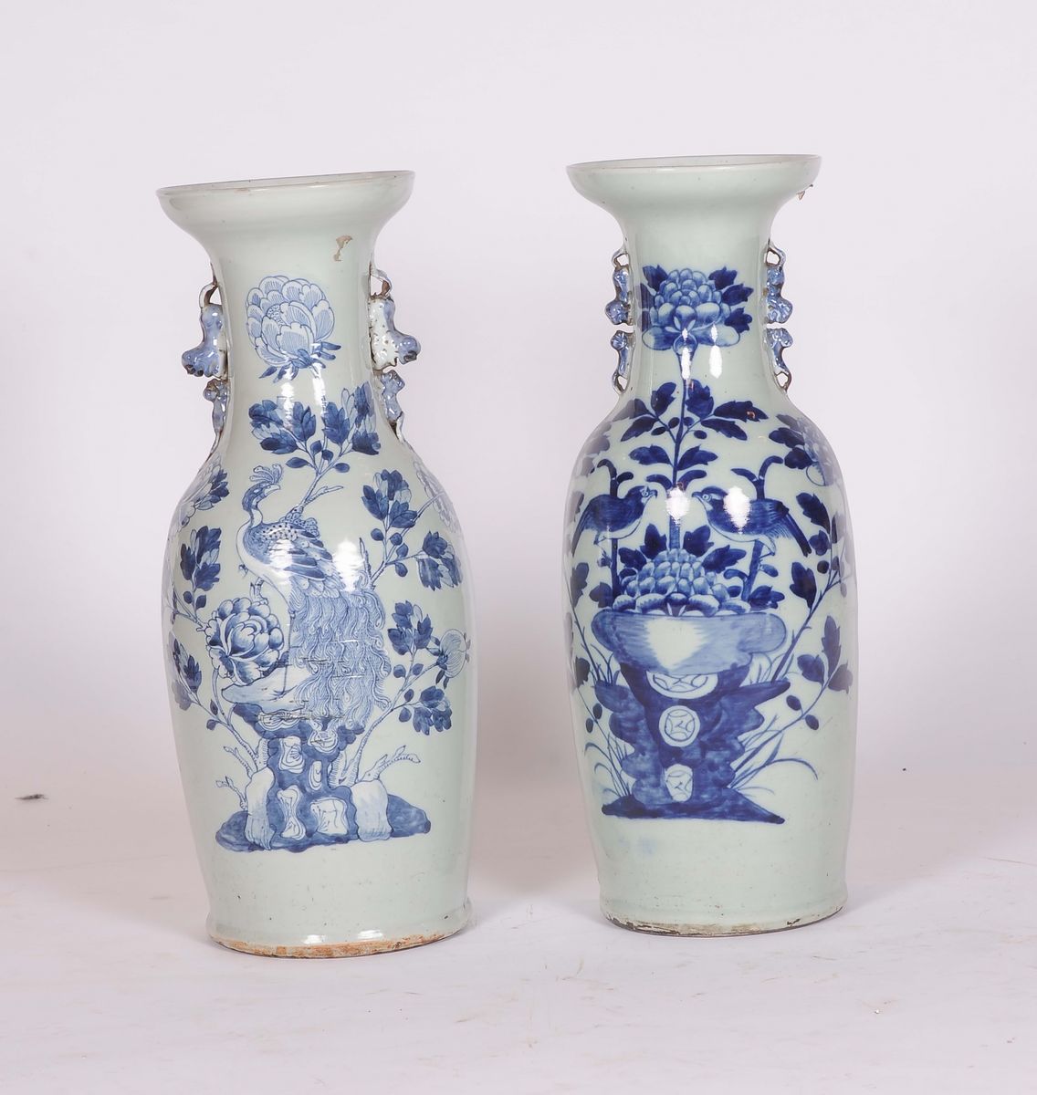 Coppia di vasi in porcellana a fondo celadon con decori in blu, Cina, Satzuma, XIX secolo