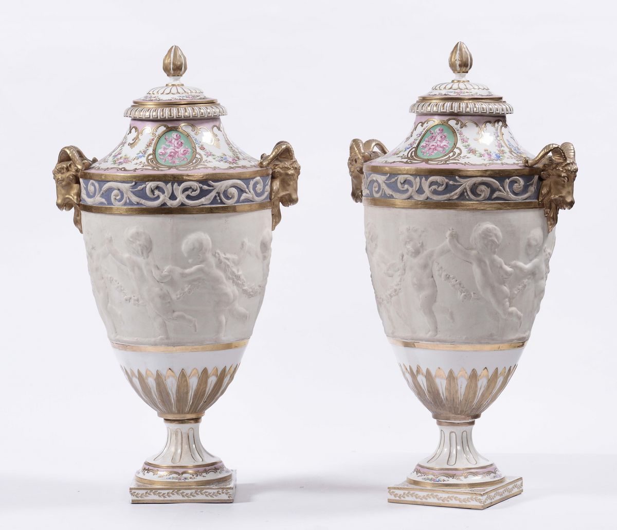 Coppia di vasi in porcellana e biscuit, XIX secolo