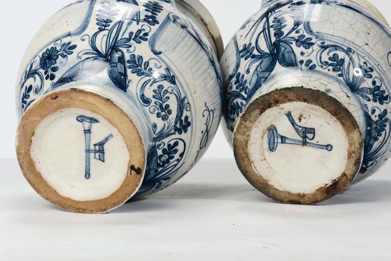 Due boccali di farmacia in maiolica bianca e blu, Albisola, fine del XVII - inizio del XVIII secolo