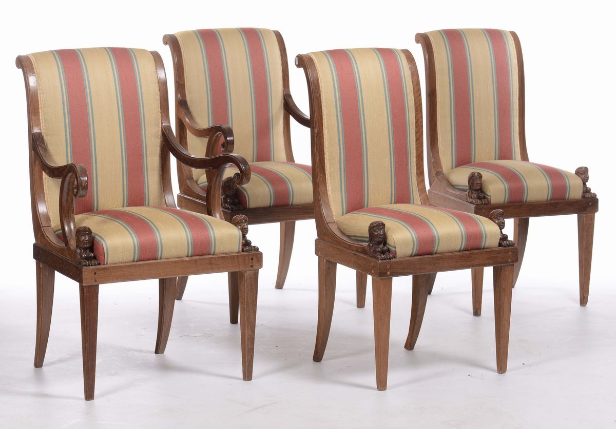 Due sedie e due poltroncine in noce Impero, XIX secolo