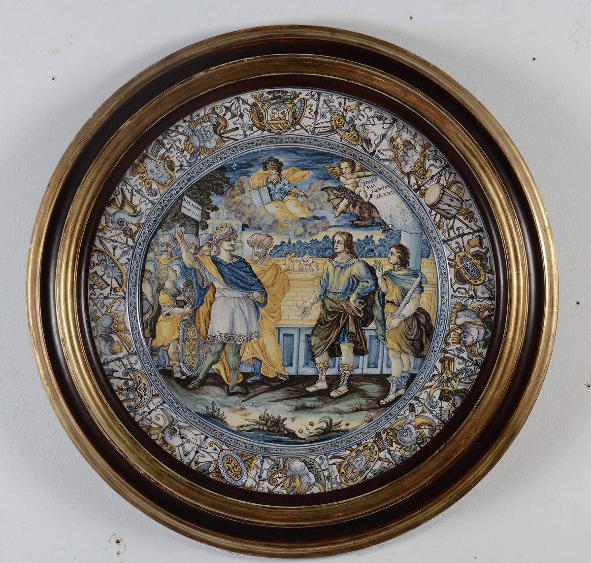 importante piatto in maiolica policroma con raffigurazione della scena nel cavetto, sulla tesa stemma nobiliare e trionfo d'armi susseguenti, diametro cm 44