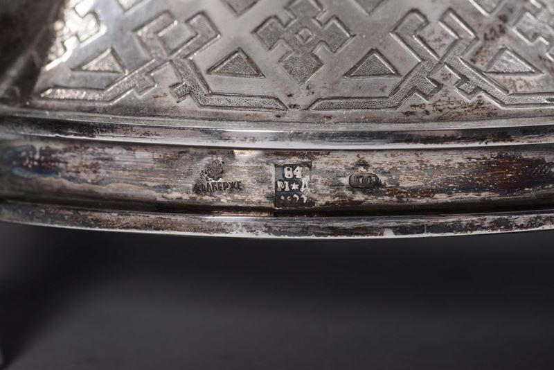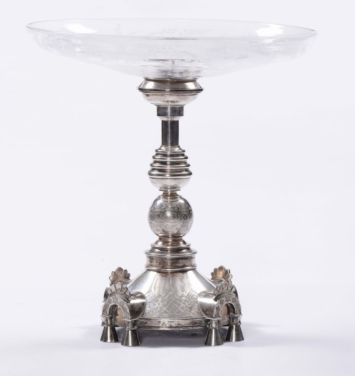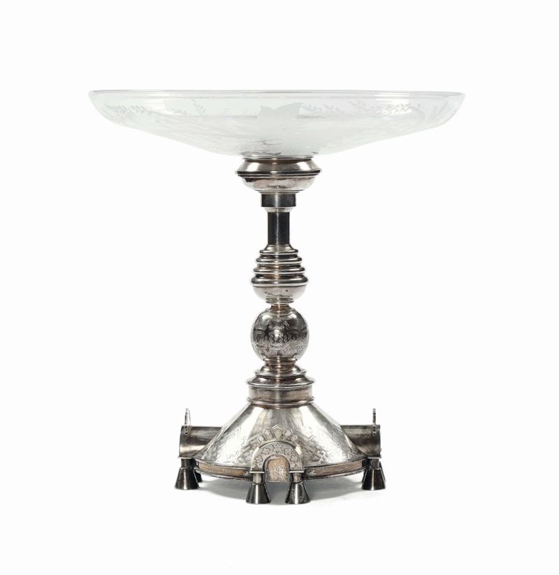 Importante alzata da tavolo in stile architettonico russo in argento con coppa in cristallo, Russia 1877