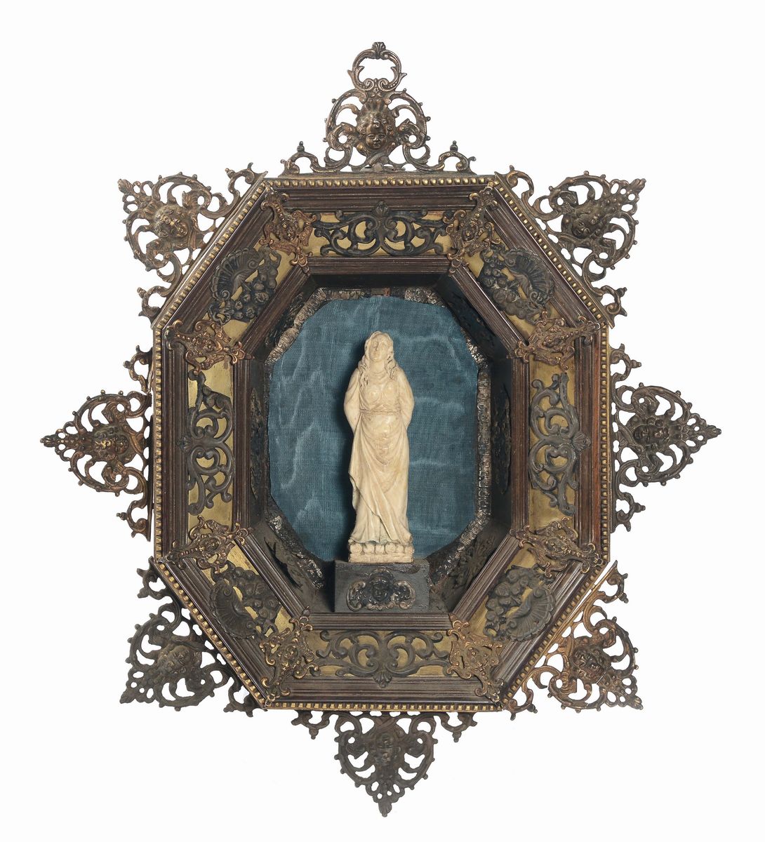 Sculturina in avorio scolpito entro cornice fiorentina in bronzo dorato del XIX secolo