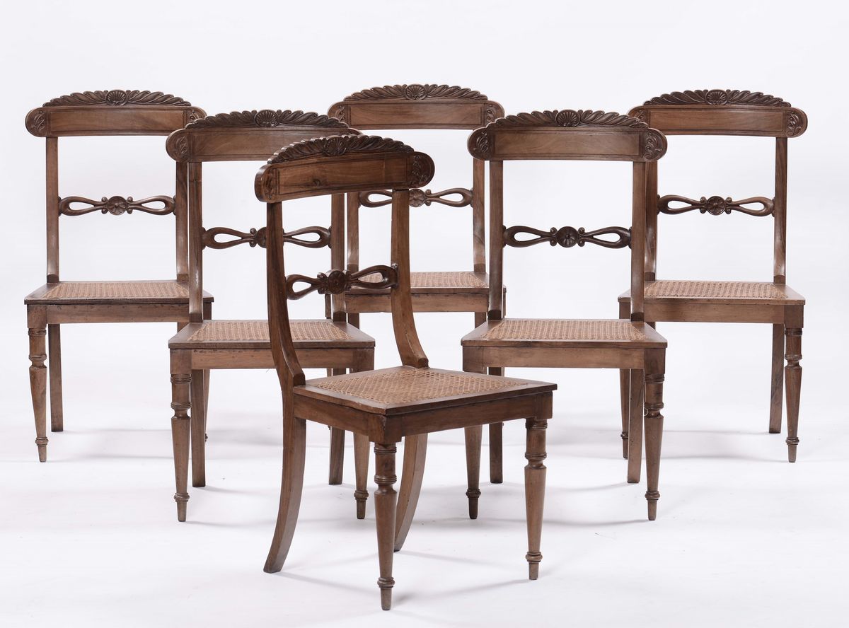 Sei sedie Carlo X in noce intagliato, XIX secolo