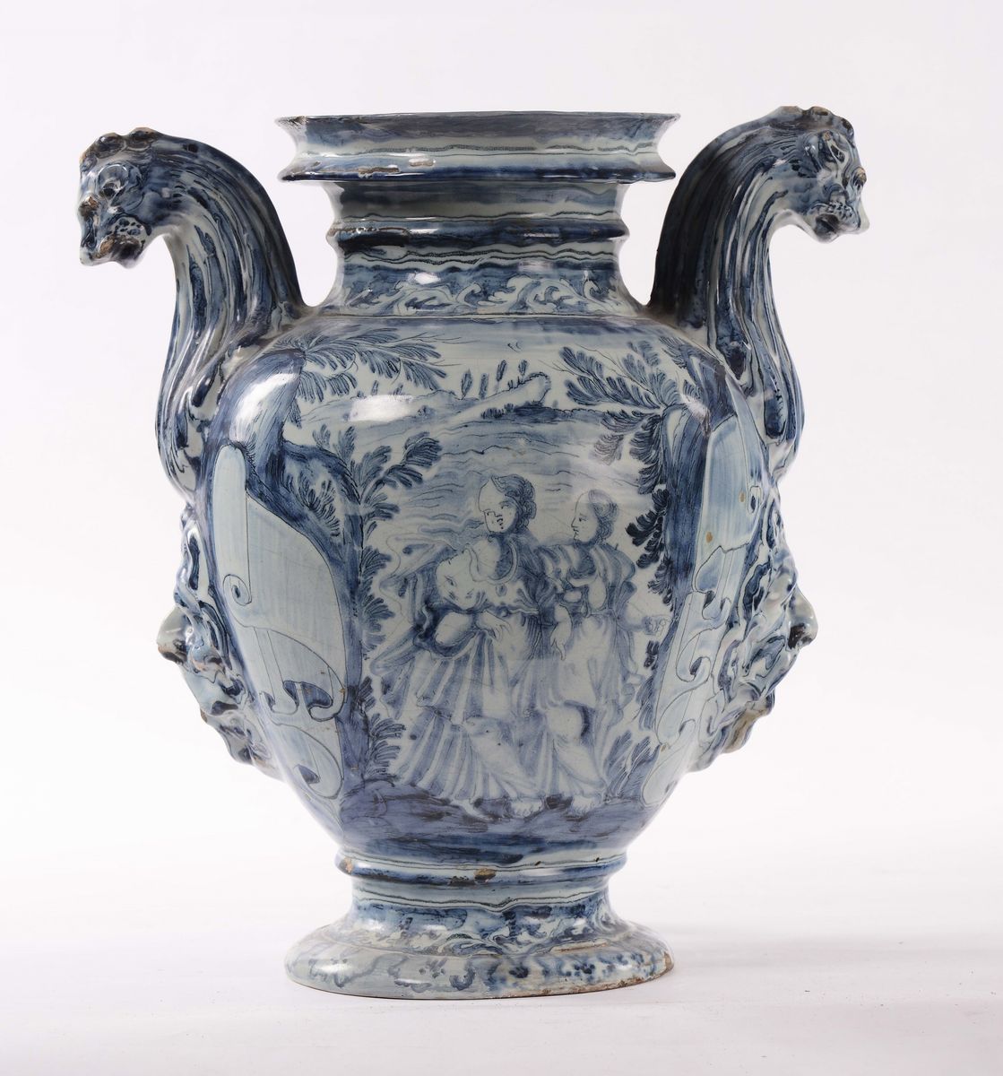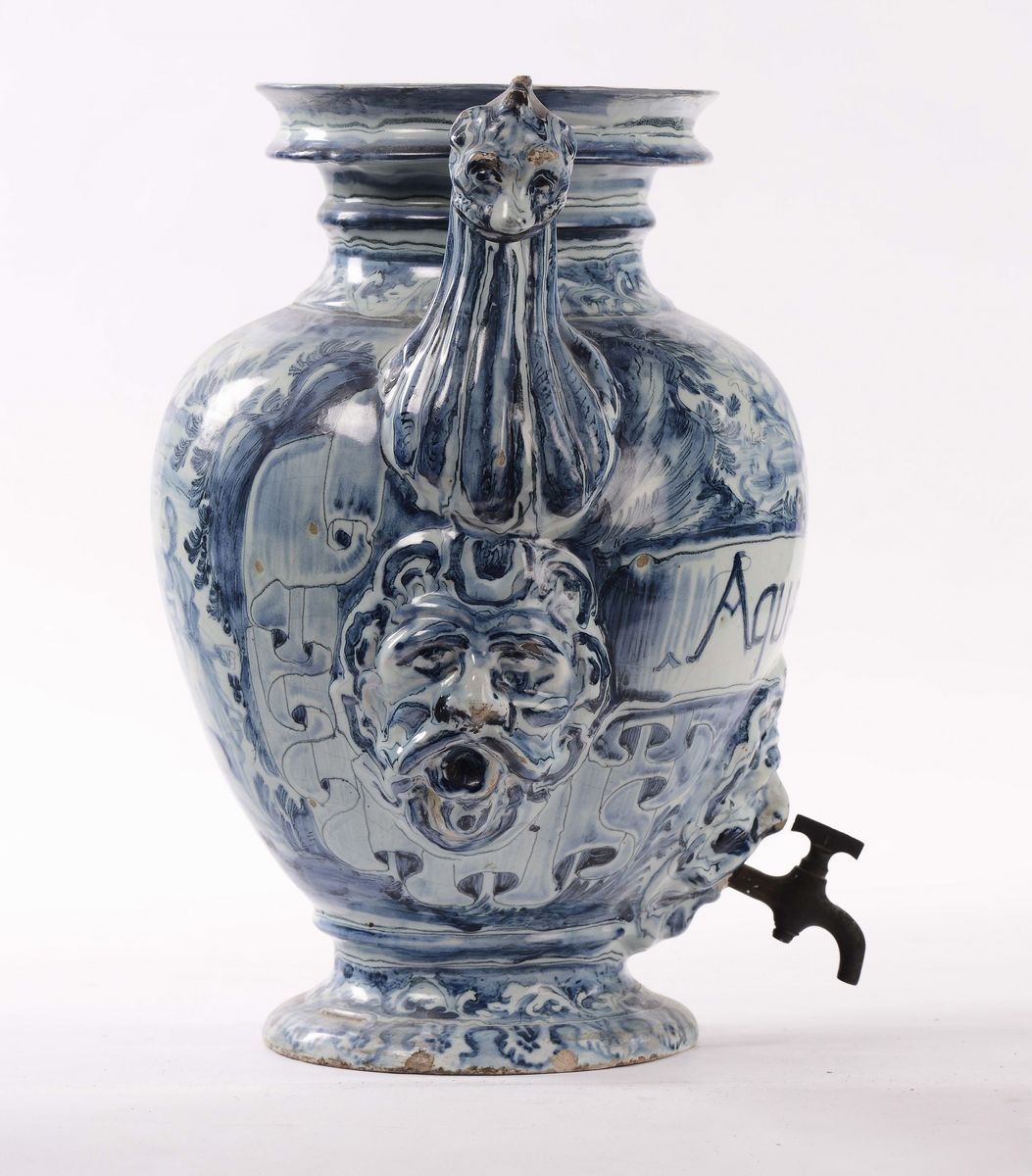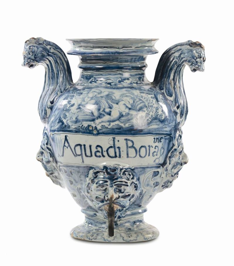 decorazione monocroma blu “a scenografia barocca” cartiglio epigrafico “Aqua di borag.”, marca Corona con le lettere BB, altezza cm 39 (difetti)