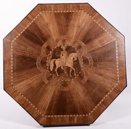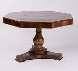 Tavolo ottagonale Carlo X lastronato ed intarsiato, Emilia XIX secolo