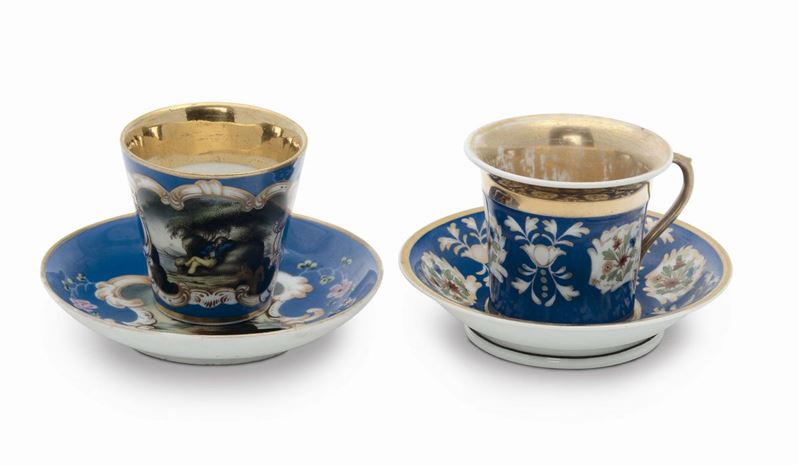 del lotto fa parte altra tazza a motivi floreali su fondo blu. Manifattura Gardner. Russia 1840, altezza cm 8