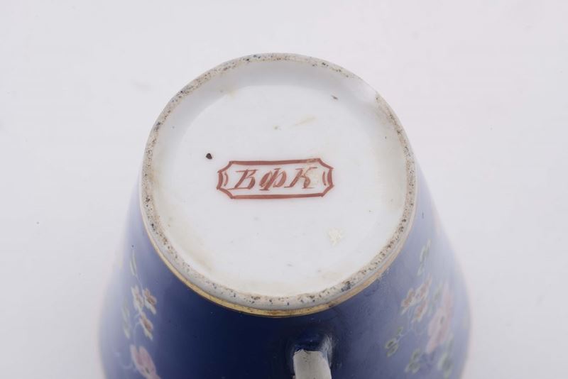 Tazza con piattino con decoro a fondo blu, Russia manifattura B.F.K., 1840-50 circa