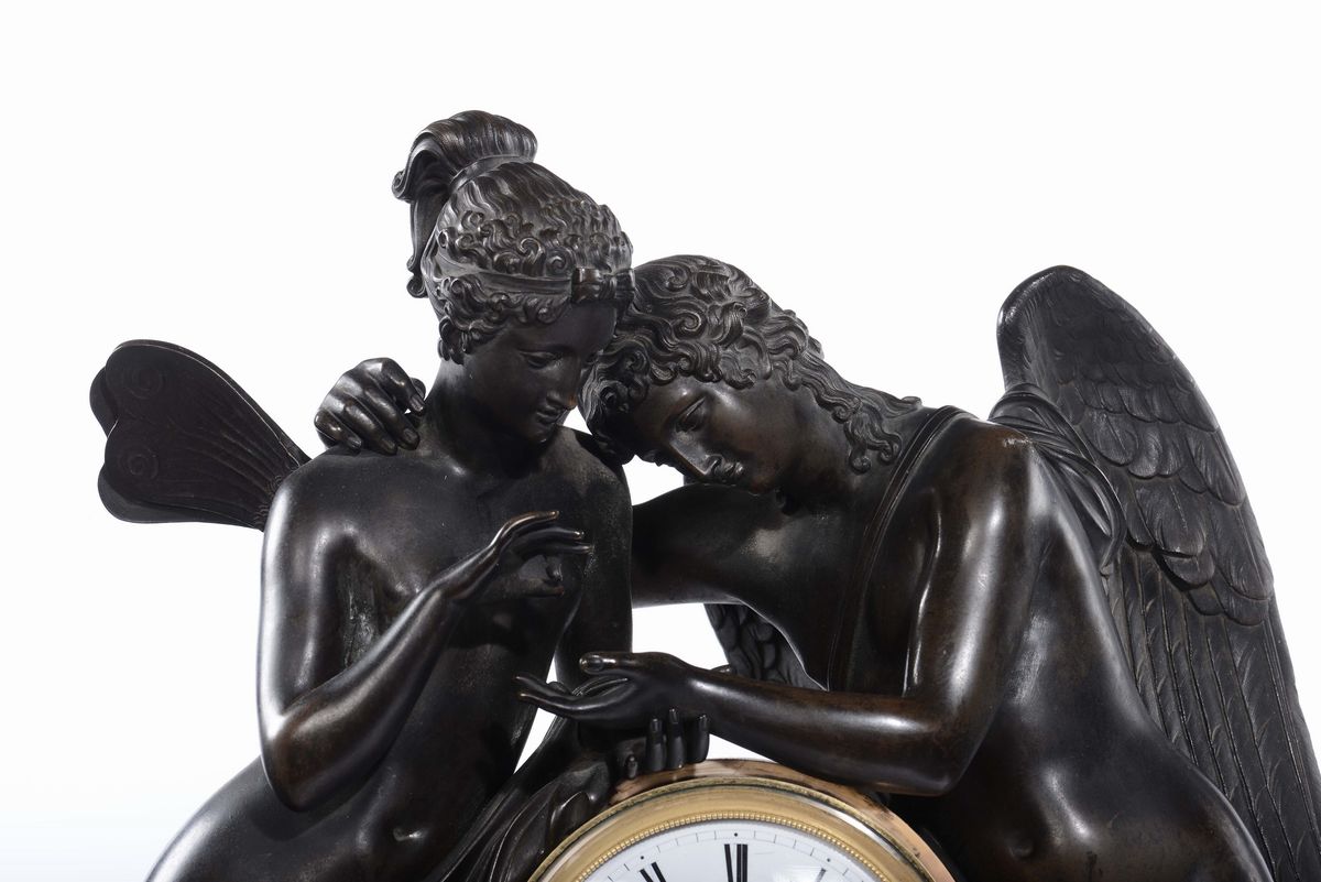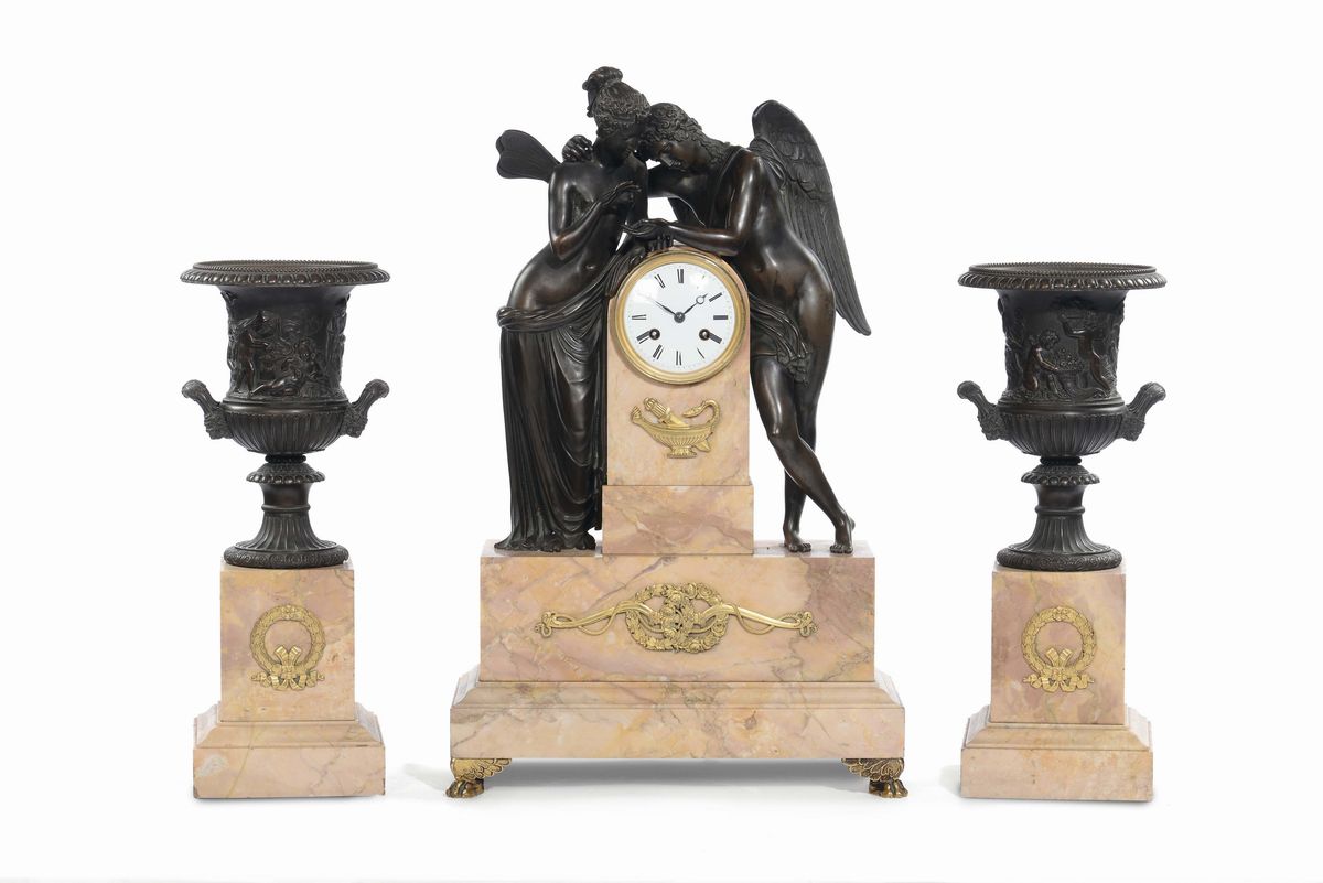 orologio con supporto in marmo decorato con applicazioni in bronzo dorato di gusto neoclassico e sormontato da figure mitologiche in bronzo patinato. Ai lati su basi a plinto coppia di vasi classici in bronzo , altezza cm 60 e coppia di vasi altezza cm 40