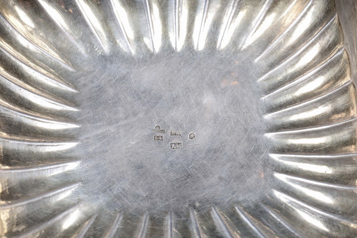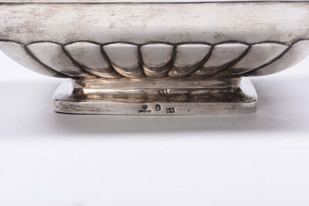 Vaschetta in argento sbalzato e inciso di sagoma quadrangolare baccellata. Russia XIX secolo