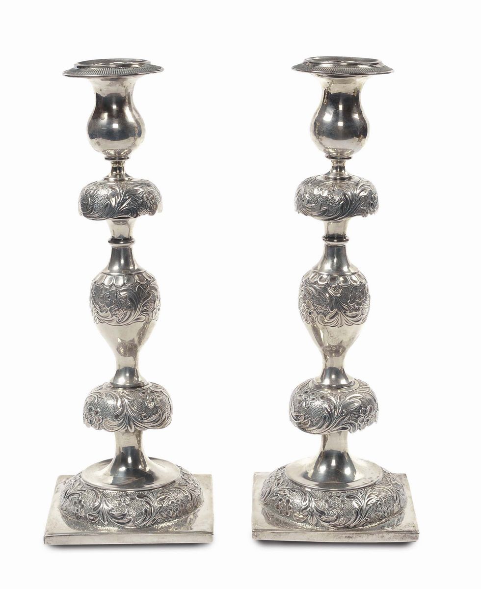 Coppia di candelieri in argento sbalzato e cesellato, Russia 1856