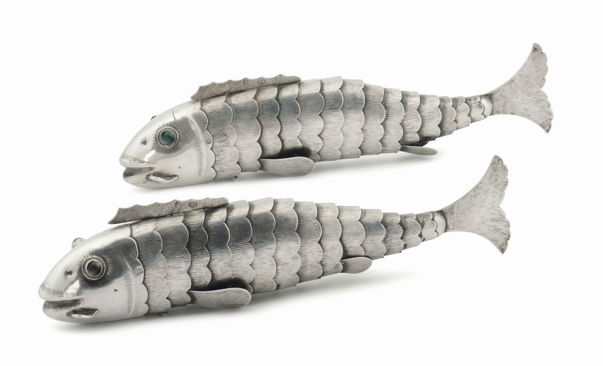 tDue figure di pesci in argento con corpo composto da elementi snodabil e occhi in pietre colorate.Punzoni austro ungarici del XIX sec. ot 800 gr cm 31