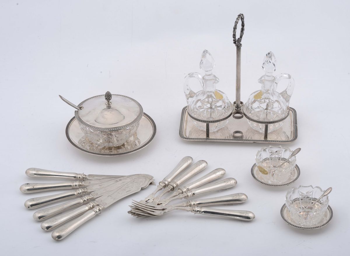 composto da oliera, formaggera, due saliere e servizio di posate da pesce per sei persone (punzoni tedeschi), gr. 140 circa
