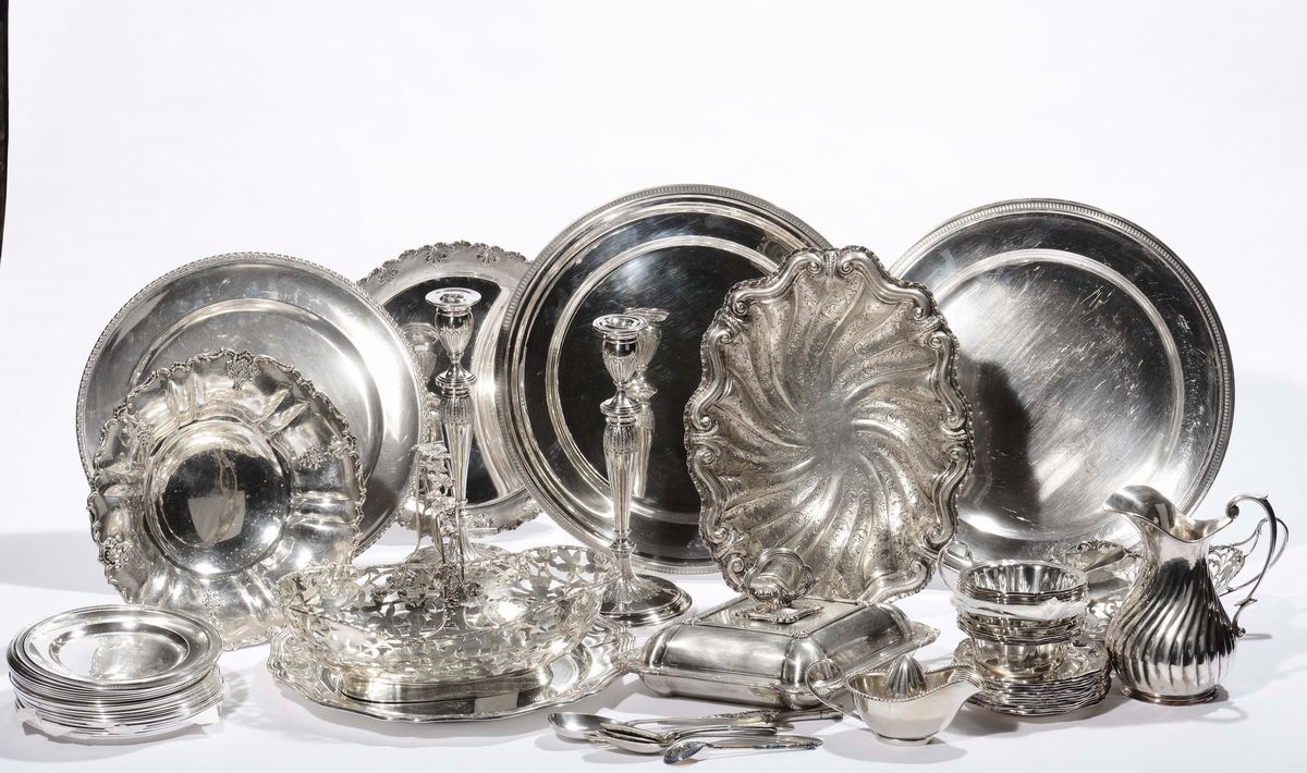 tra cui piatti, candelieri, coppette, cestini e altro, gr. 1450 circa