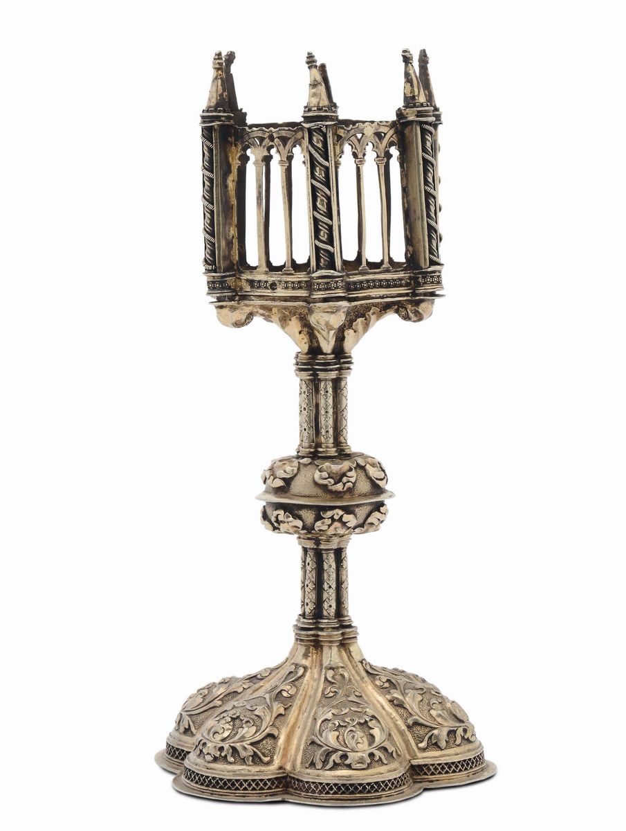 base polilobata baccellata e decorata con motivi fitoformi, fusto a colonne con nodo di forma ovale schiacciata, parte superiore architettonica con motivi traforati e pinnacoli poggiante su base con decori fogliacei, gr. 50 circa, altezza cm 23,5