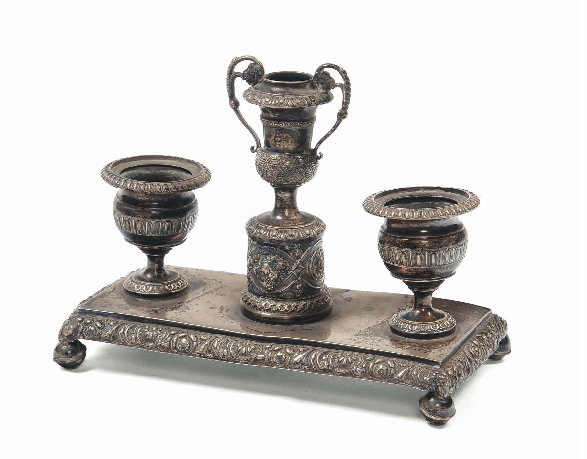 Piccolo calamaio a tre elementi in argento, Milano, Francesco Liverti (1812-1872)
