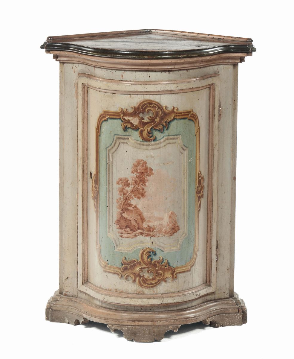 Angoliera ad uno sportello bombato in legno intagliato e decorato a colore, Veneto seconda metà XVIII secolo
